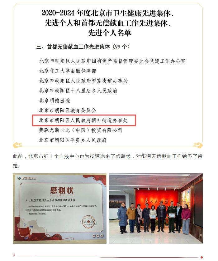 喜报!朝外街道荣获“首都无偿献血工作先进集体”称号!