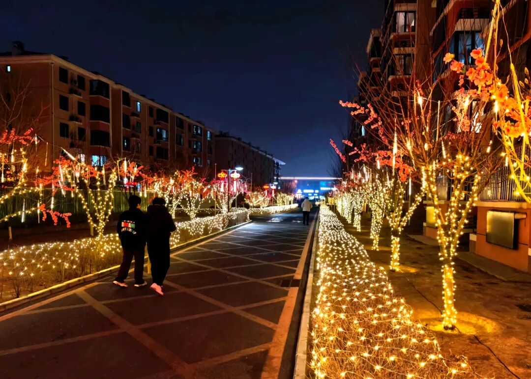 行道树披上碎星织就的薄纱,居民楼下,暖黄的灯带勾勒屋檐,窗边零星亮起的福字挂件,是千家万户不约而同的守望。