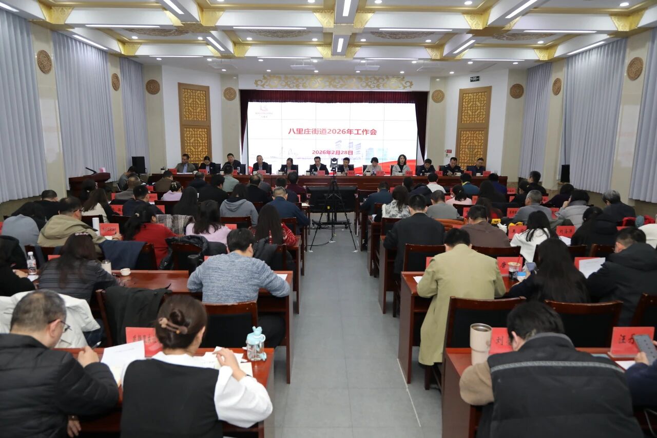 2月28日下午,八里庄街道召开2026年工作会,总结回顾2025年全年工作,研究部署2026年重点任务。街道全体机关和社区干部、八里庄派出所所长、市场所所长、消防监督员、“两代表一委员”、离退休干部代表及商圈党委副书记参会。会议由街道党工委副书记、办事处主任曲兆宇主持。