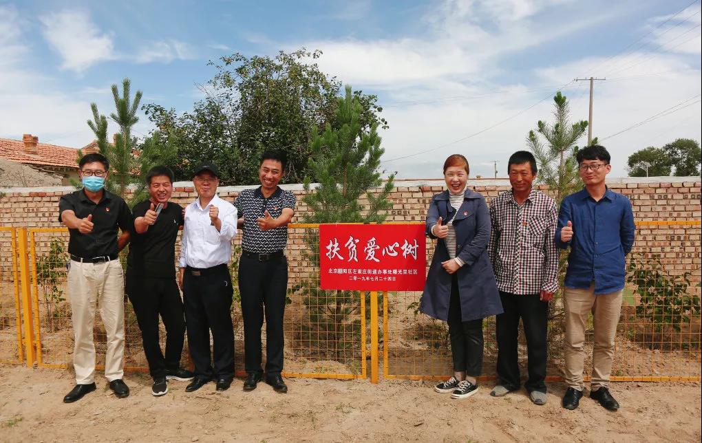 ▲大家一同在 “扶贫爱心树”前合影留念。这些樟子松由2019年7月24日曙光里社区党员干部栽种,是两地携手脱贫的见证。