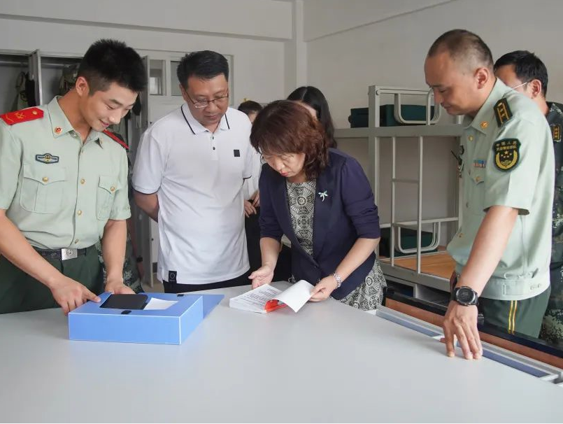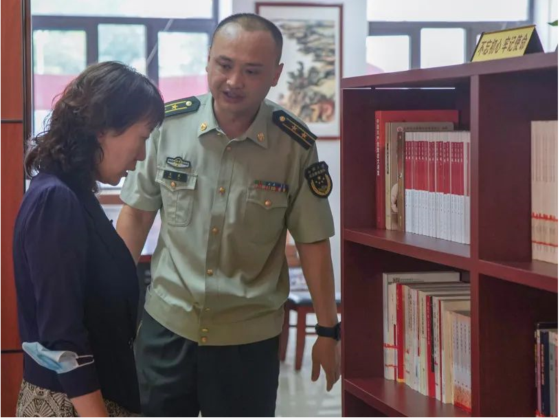 在部队教导员的指引下,大家参观了阅览室及战士寝室,并对本年度街道为部队送去的近百册党史学习书籍表示感谢。
