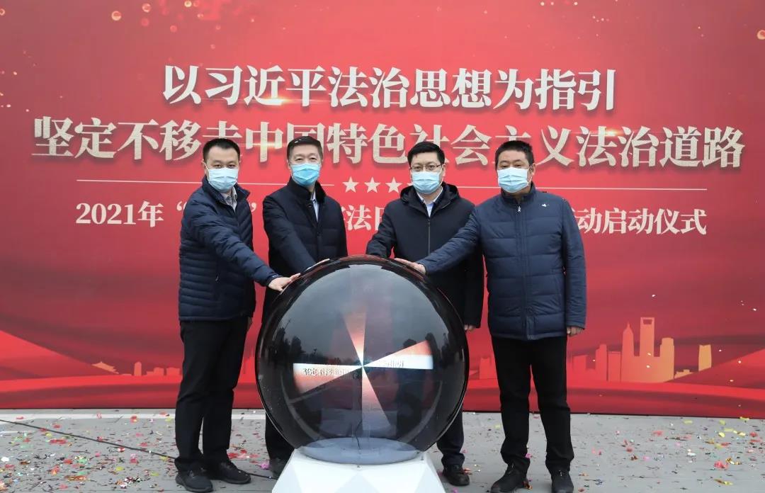 在现场倒计时中,朝阳区司法局副局长胡胜利、八里庄街道工委书记闫培文、办事处主任李伟、京师律所党委书记宋晓江共同上前,点亮启动球,共同开启了2021年“宪法宣传周”活动。