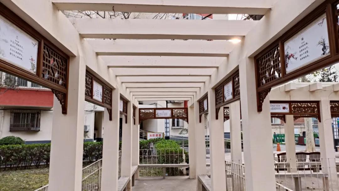 为了让这个议事场所更加美化,社区在原有的连廊两侧增加具有传统风格的实木挂落12幅,挂落上展示中华民族优秀文化的《家风家训》格言、画面和有关党建的金句、画面。