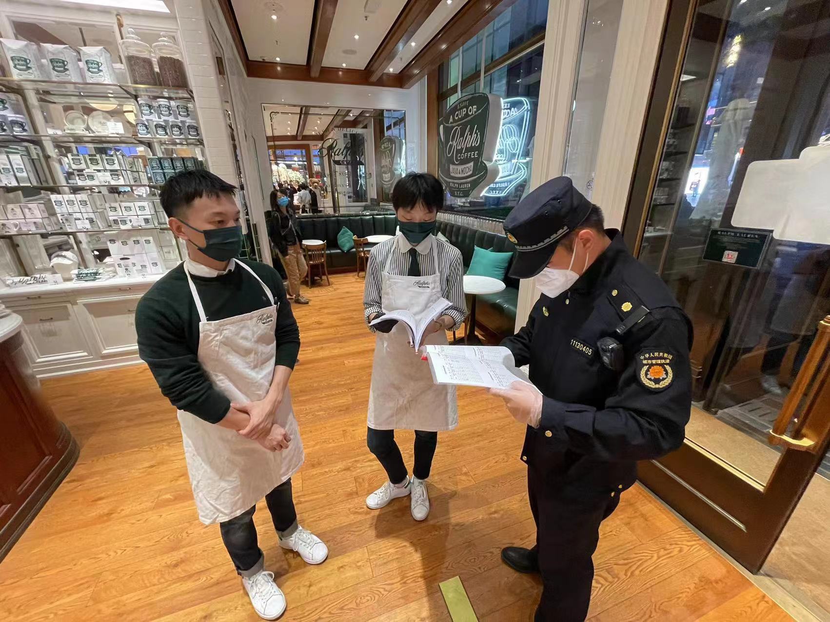 10月17日,三里屯执法队对辖区商户疫情防控工作进行检查。 (通讯员 三里屯 周爽)
