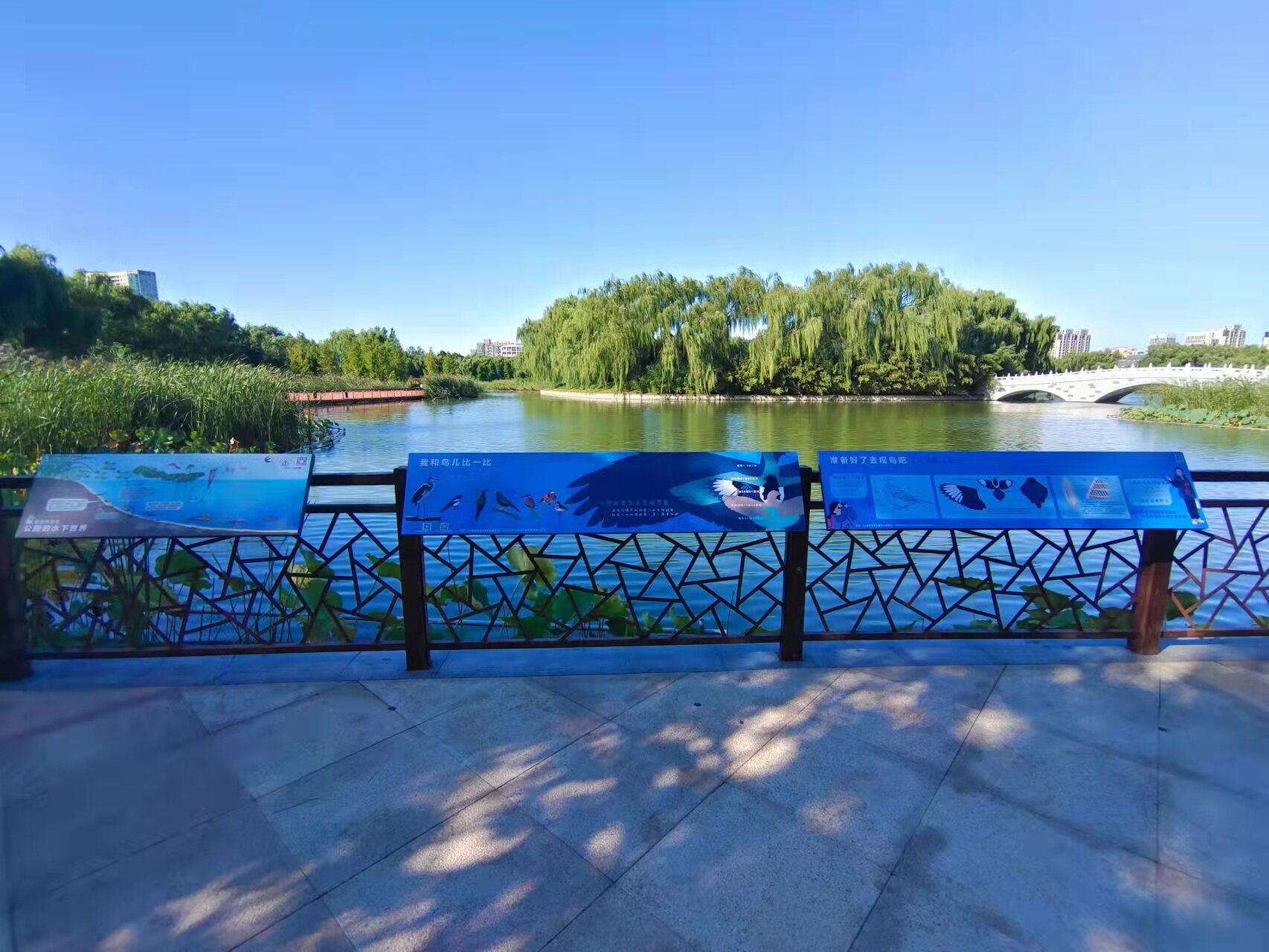 红领巾公园作为首都生态文明宣传教育基地,始终秉持“红色引领 绿色发展”的理念。公园根据自身特点合理利用生态资源,通过自然导赏路线向广大游客展示园内丰富的植物、鸟类和湿地等自然景观。此次在环湖栈道沿线新增6块标识展板,其中湿地科普径新增4块,介绍湿地的综合功能,红领巾公园湿地物种关系以及动植物生态链的运转。观鸟平台新增2块,介绍观鸟方式的基本原则,科普鸟类身体结构以及红领巾公园常见鸟类翼展等相关知识。