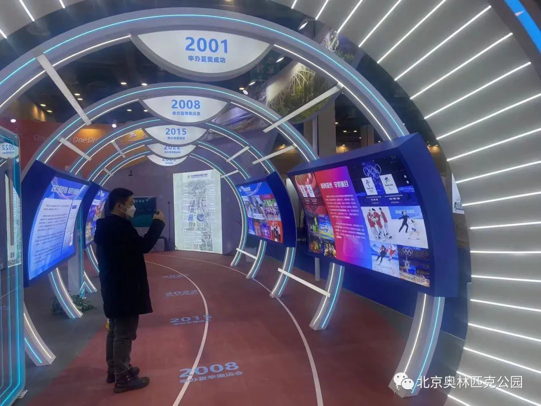 本届两博会上,中心区展位以时空隧道为主题,集中展示了自2001年申办夏奥成功至2023年各个历史阶段发展历程和辉煌成绩。