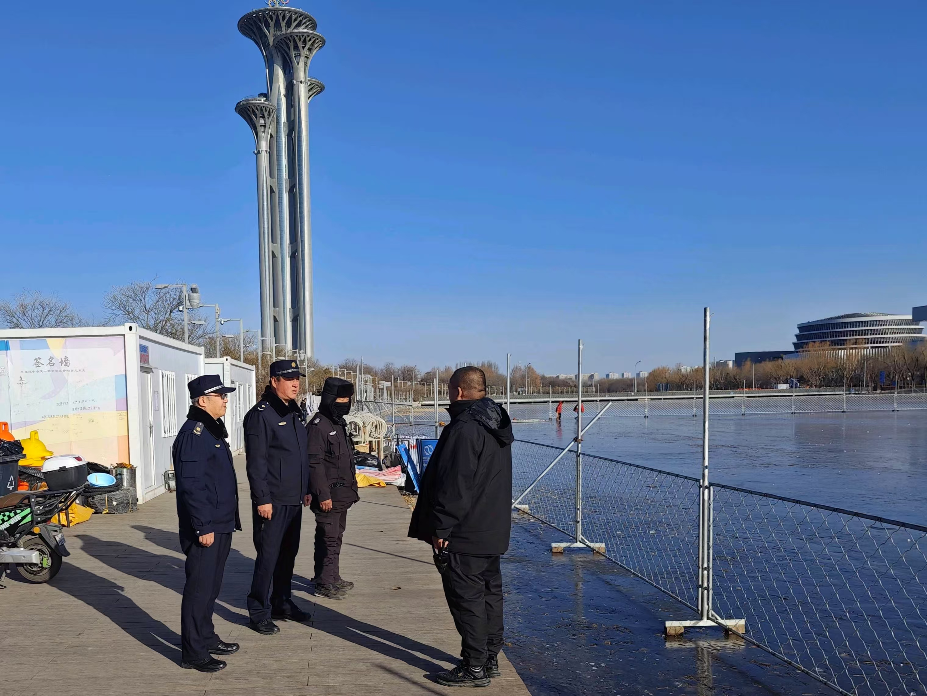 1月2日,奥林匹克中心区执法队巡查园区龙形水系,规范冰场搭建施工现场,确保游客游园安全。(通讯员 奥林匹克中心区 沈庆锋)