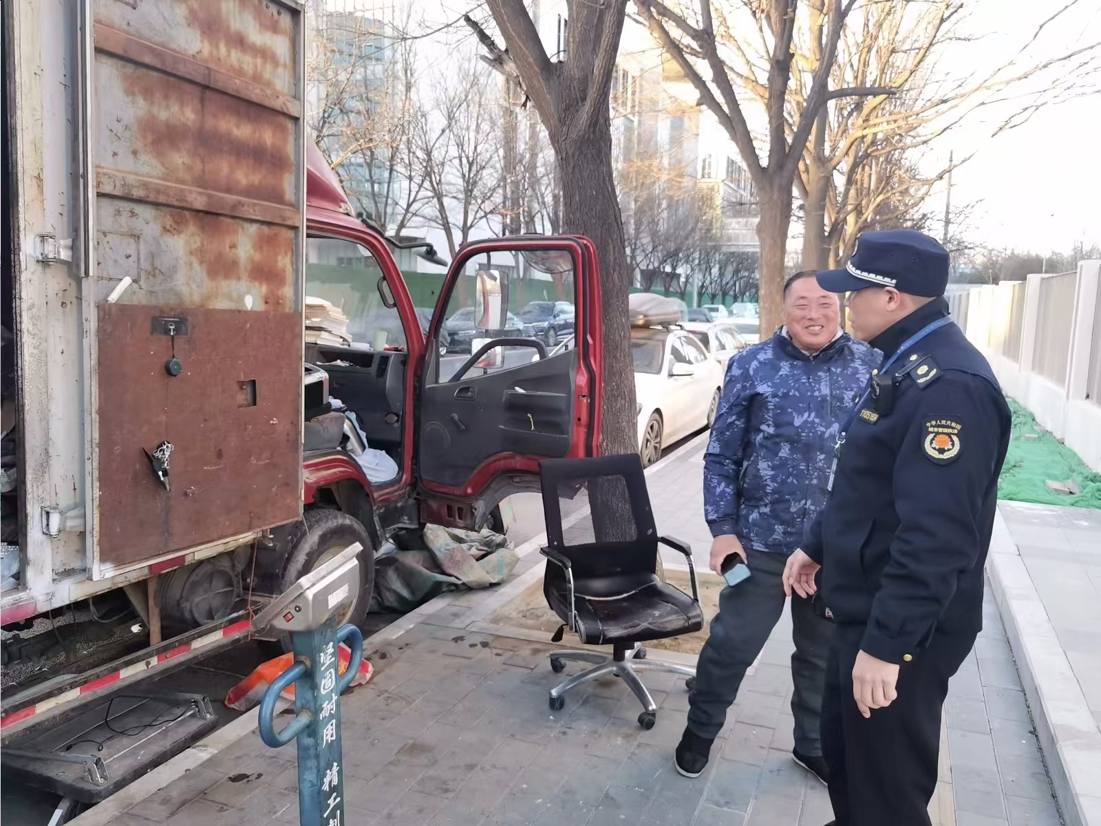1月1日,崔各庄执法队规范辖区店铺“门前三包”。(通讯员 崔各庄 郝运)