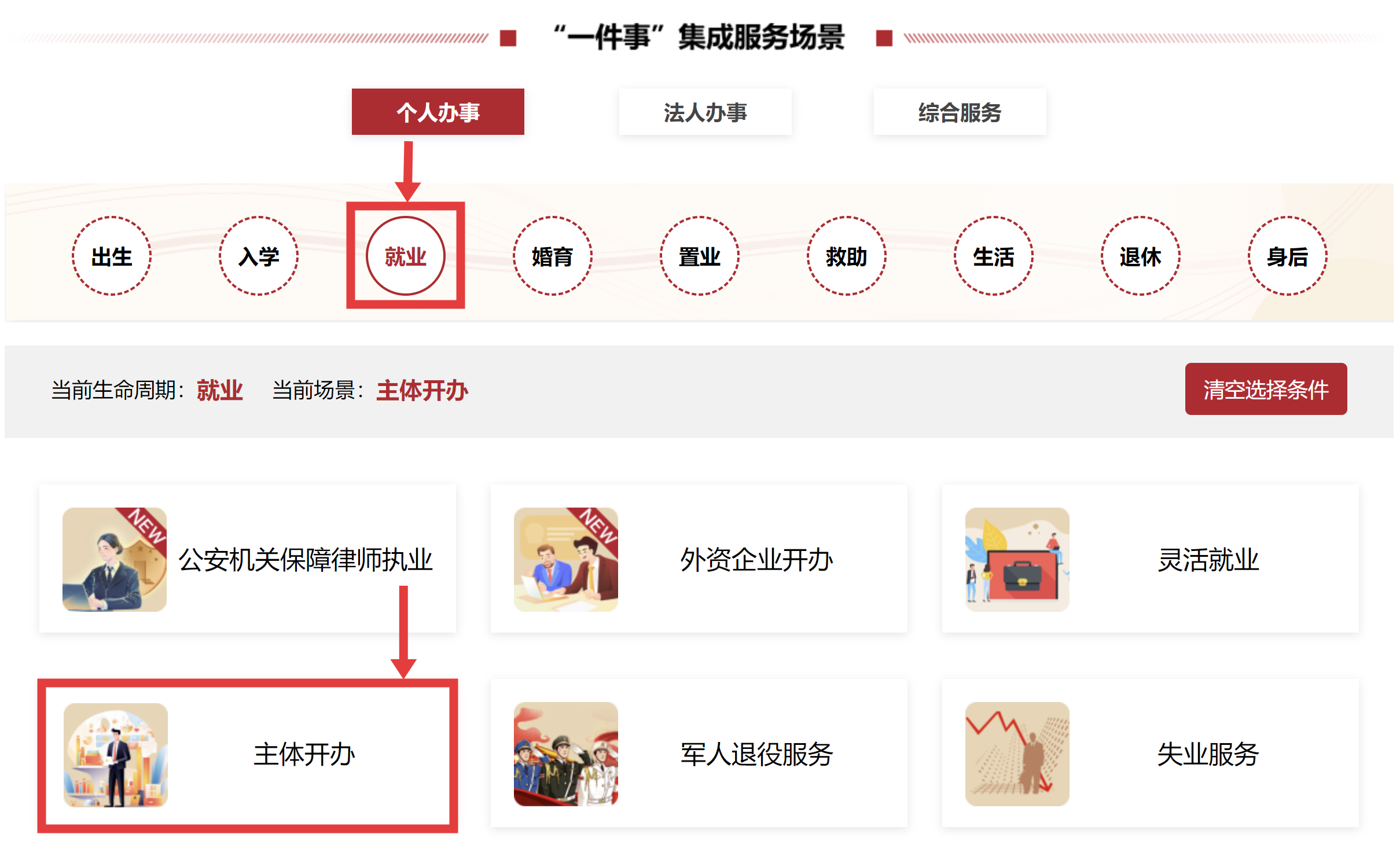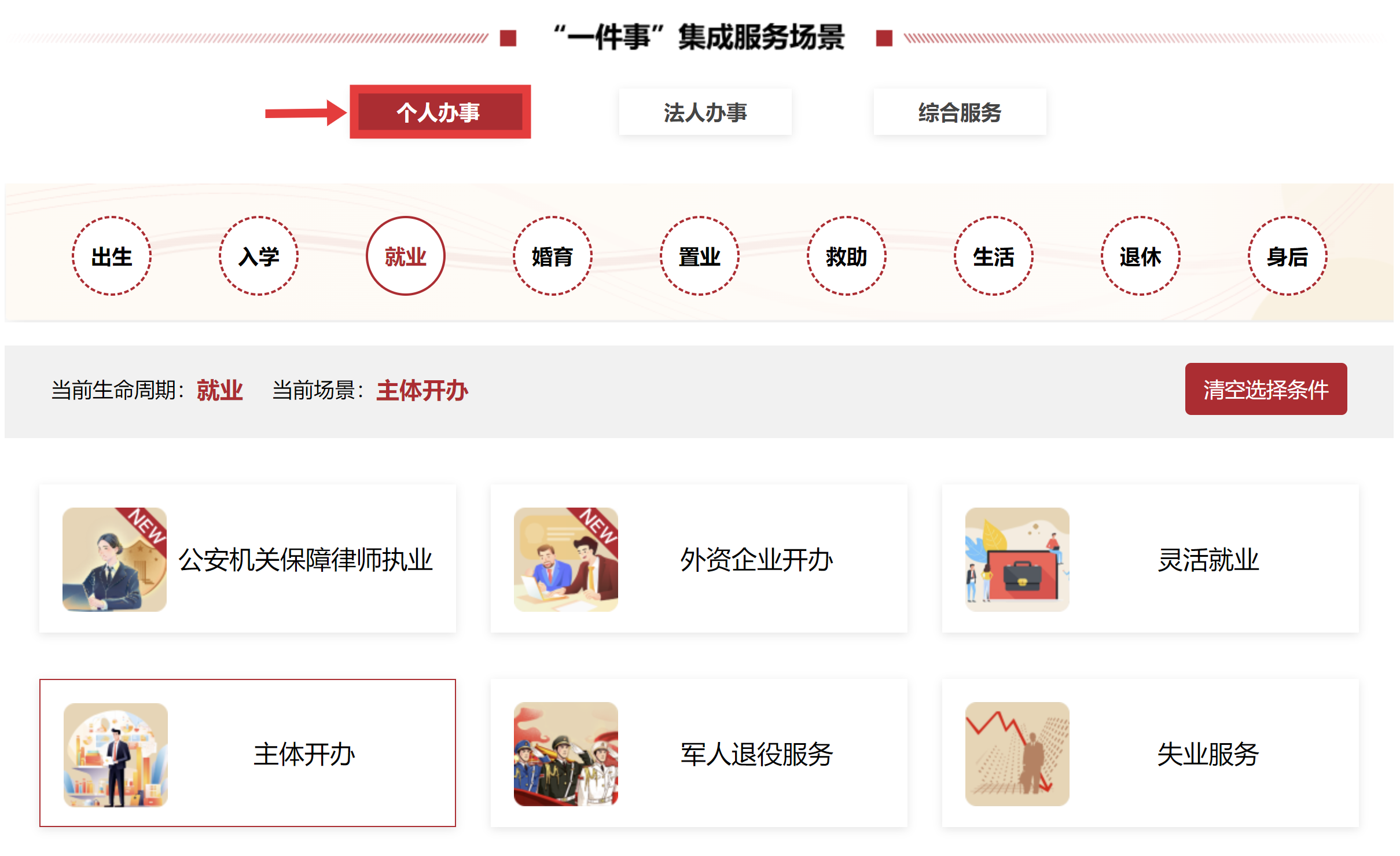3.在“个人办事”场景页面,先点击“就业”,再点击“主体开办”;