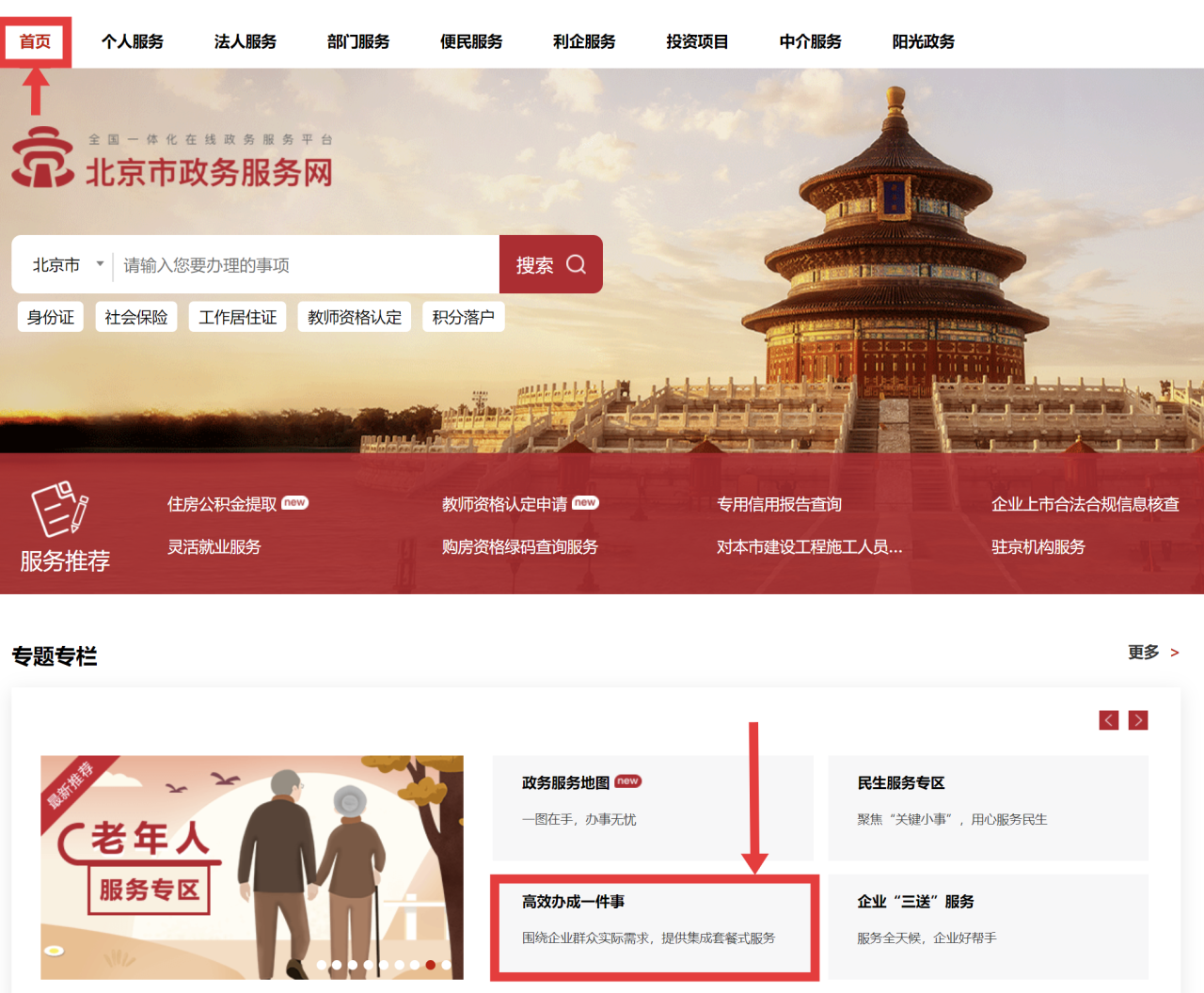 1.登录【北京市政务服务网】(https://banshi.beijing.gov.cn/),在“专题专栏”中,点击“高效办成一件事”。