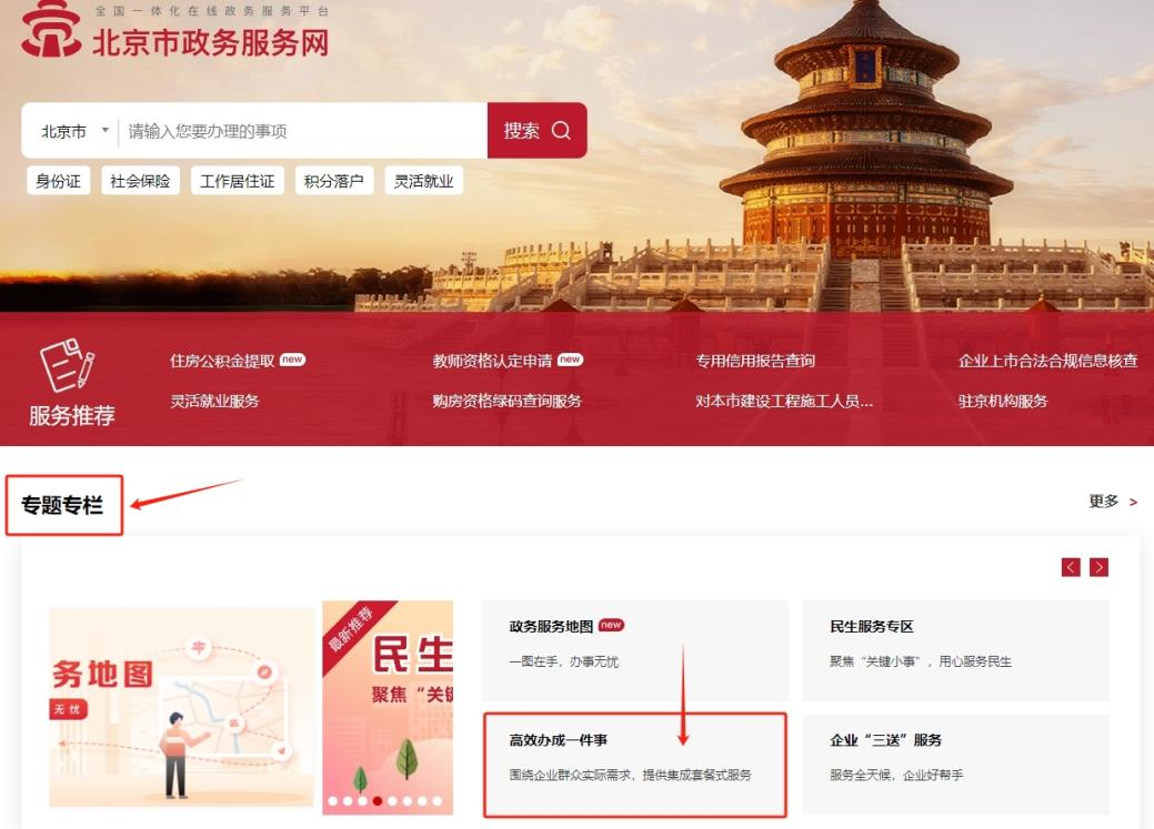 1.登录【北京市政务服务网】(https://banshi.beijing.gov.cn/),在“专题专栏”中,点击“高效办成一件事”。