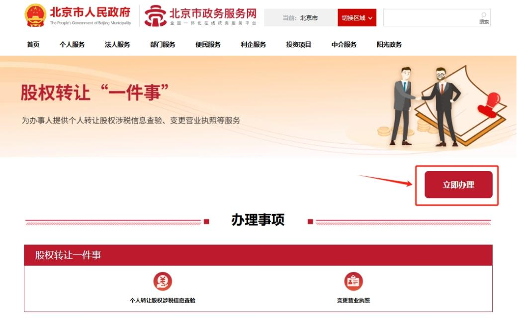 3.在股权转让“一件事”页面,点击“立即办理”。