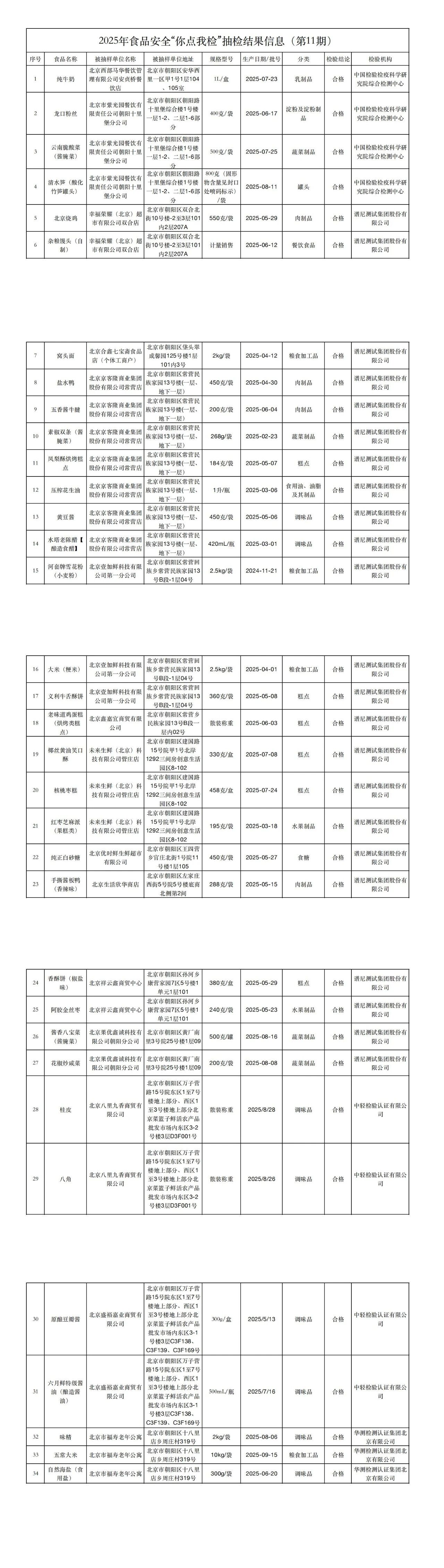 佳节又重阳,“你点我检”护安康。为切实弘扬敬老爱老传统,守护“银发一族”的饮食安全,朝阳区市场监督管理局在朝阳区敬老月期间聚焦老年群体开展了食品安全“你点我检”活动,在养老院、农贸市场、超市、餐饮店等老年群体高频消费场所抽取了大家比较关心的乳制品、粮油、果蔬制品、肉制品、糕点、调味品等食品品种,经第三方检验机构检测均合格。现将抽检结果公示如下: