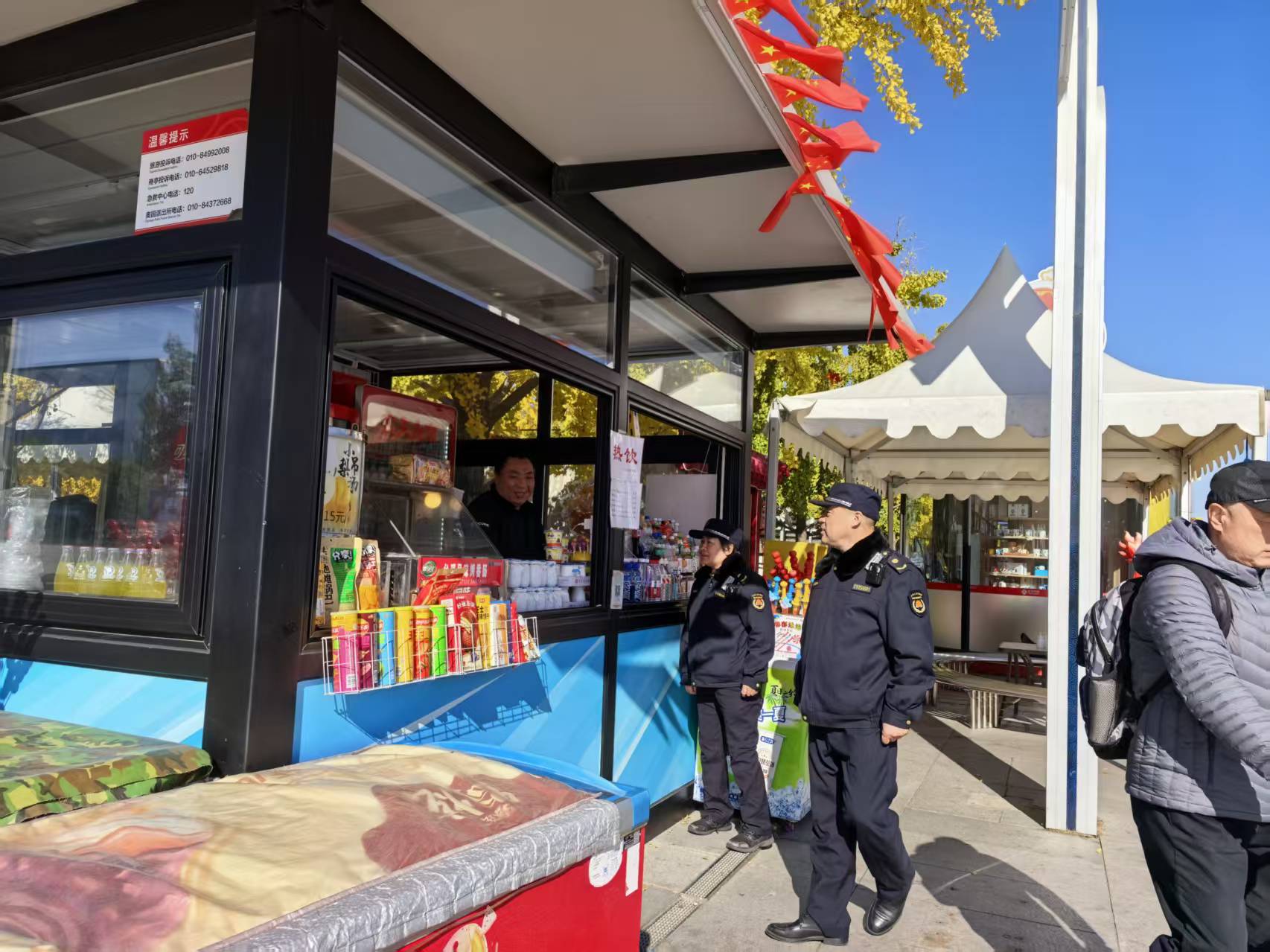 11月13日,奥林匹克中心区执法队检查园区商亭“门前三包”情况。(通讯员 奥林匹克中心区 沈庆锋)