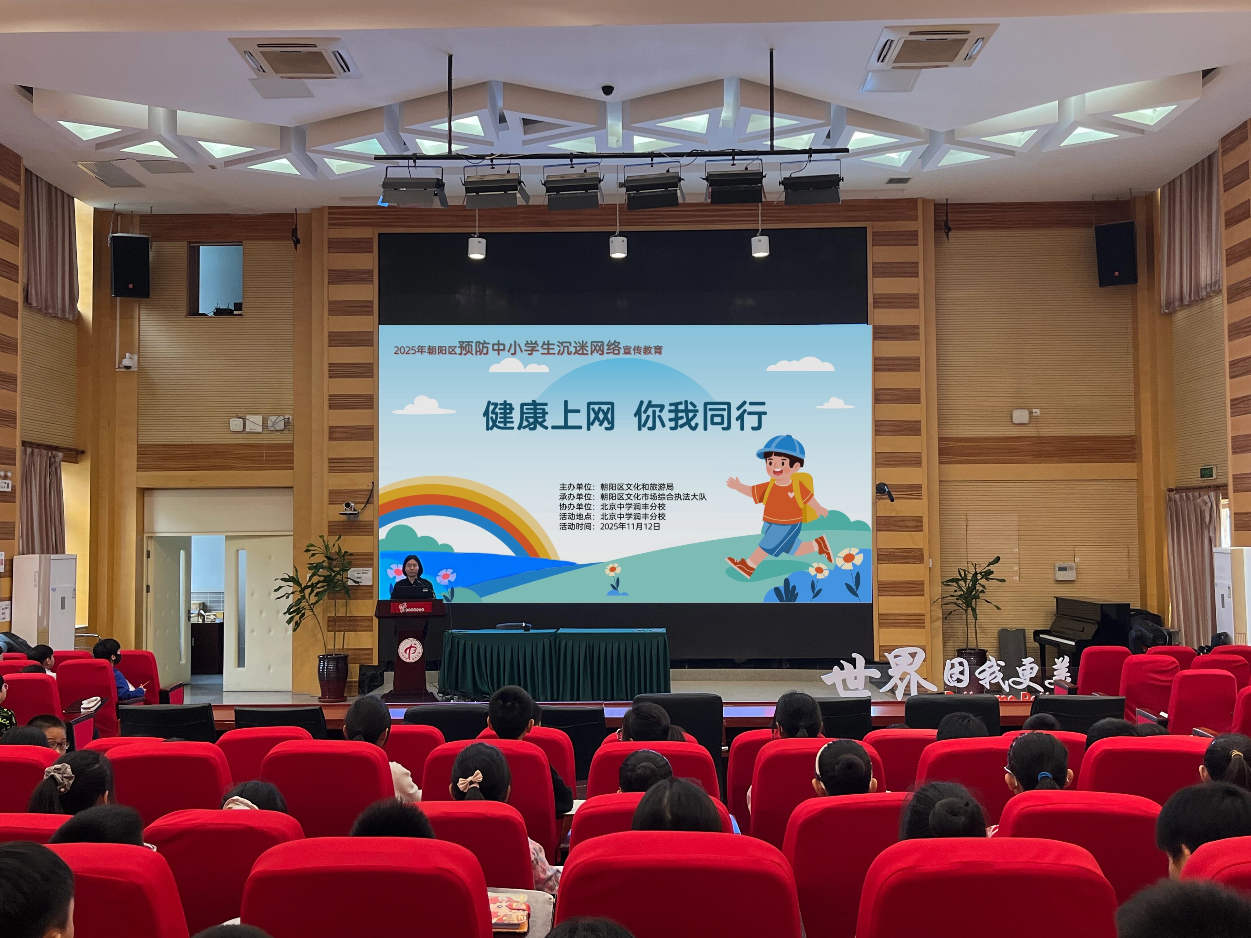 为助力青少年树立科学的网络使用意识、促进未成年人全面健康发展,11月12日,朝阳区文化市场综合执法大队走进北京中学润丰分校,开展“健康上网 你我同行”预防中小学生沉迷网络宣传教育活动。