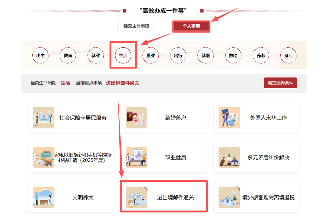 2.在“一件事”集成服务场景专区内,点击“个人事项”场景,点击“生活”,点击“进出境邮件通关”;
