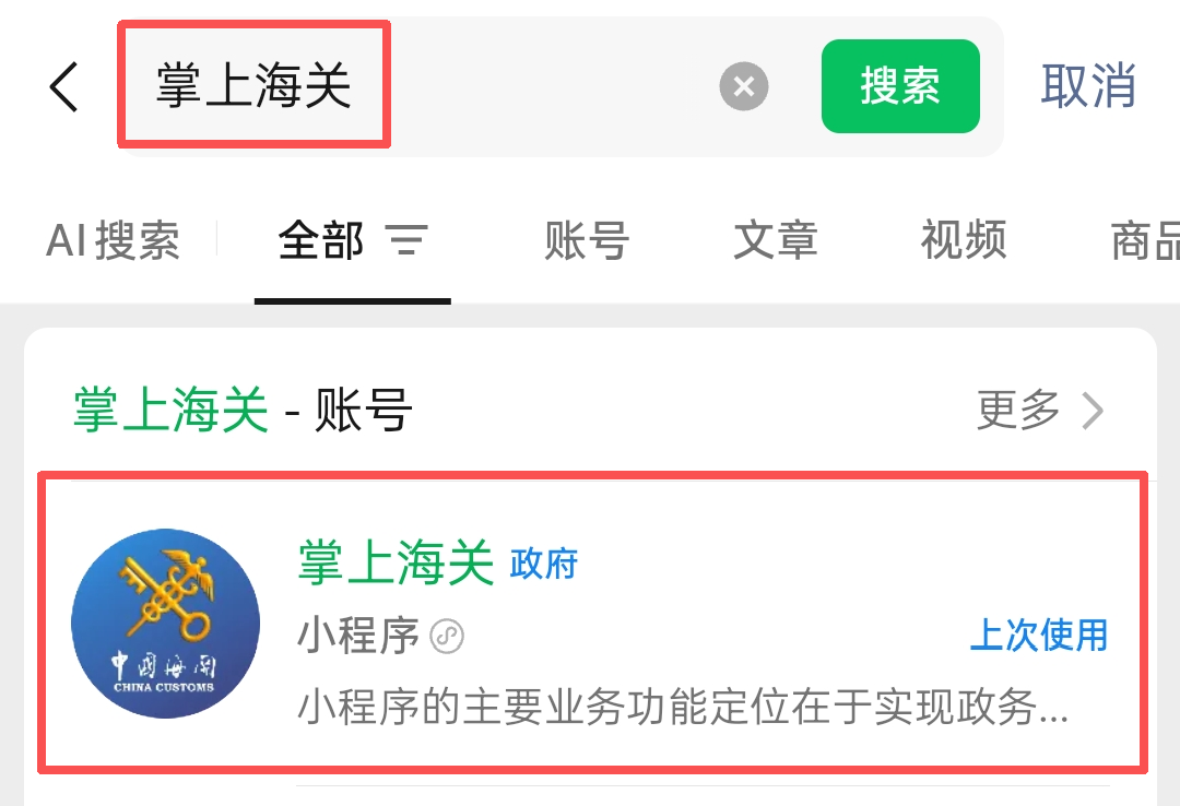 1. 在微信搜索“掌上海关”进入微信小程序/APP;