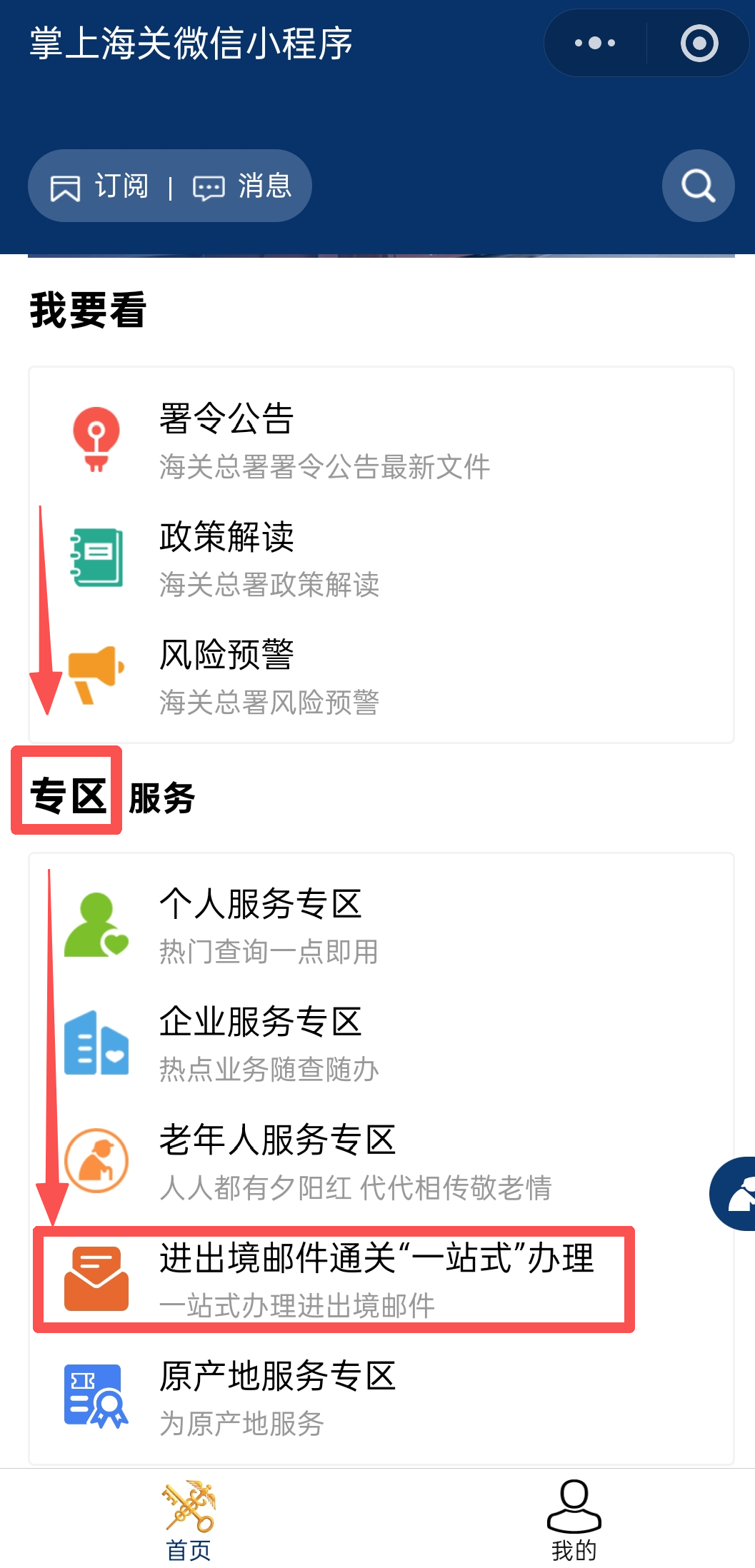 2. 在首页“专区”版块找到“进出境邮件通关一站式办理”;