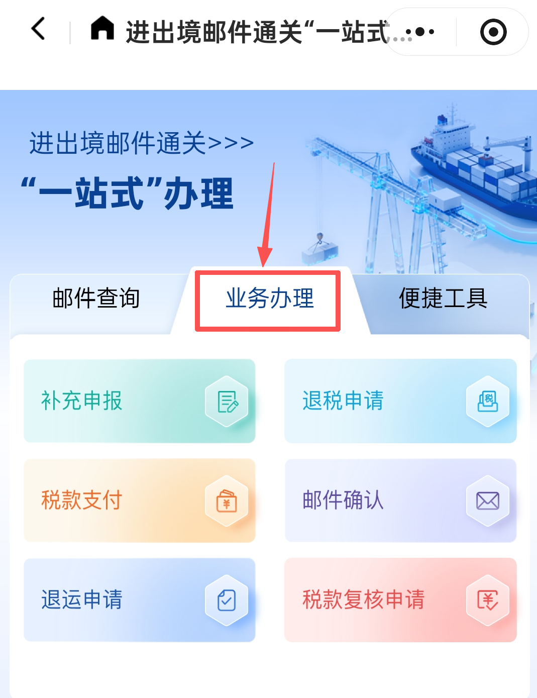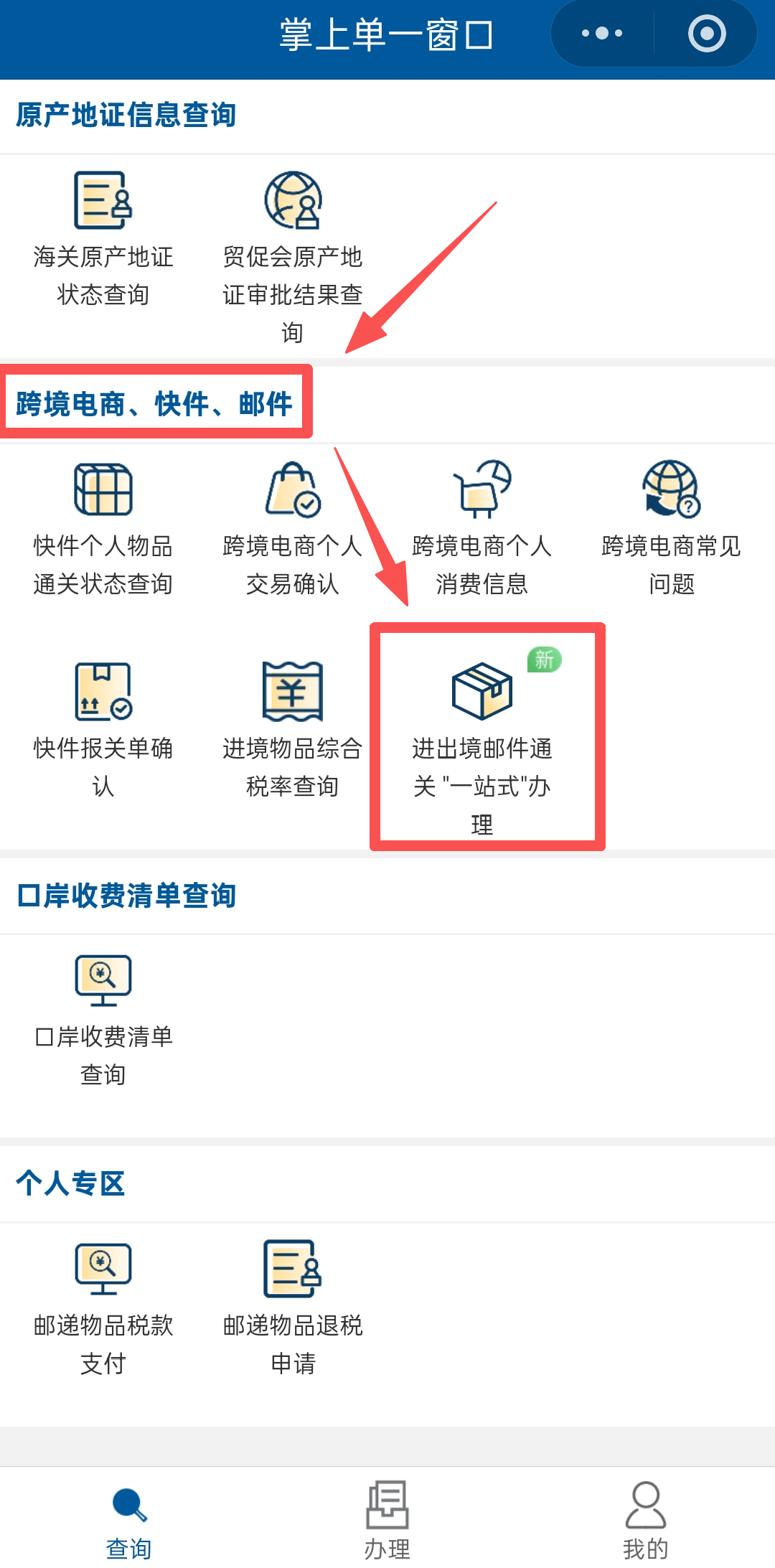 2. 在“跨境电商、快件、邮件”版块找到“进出境邮件通关一站式办理”;
