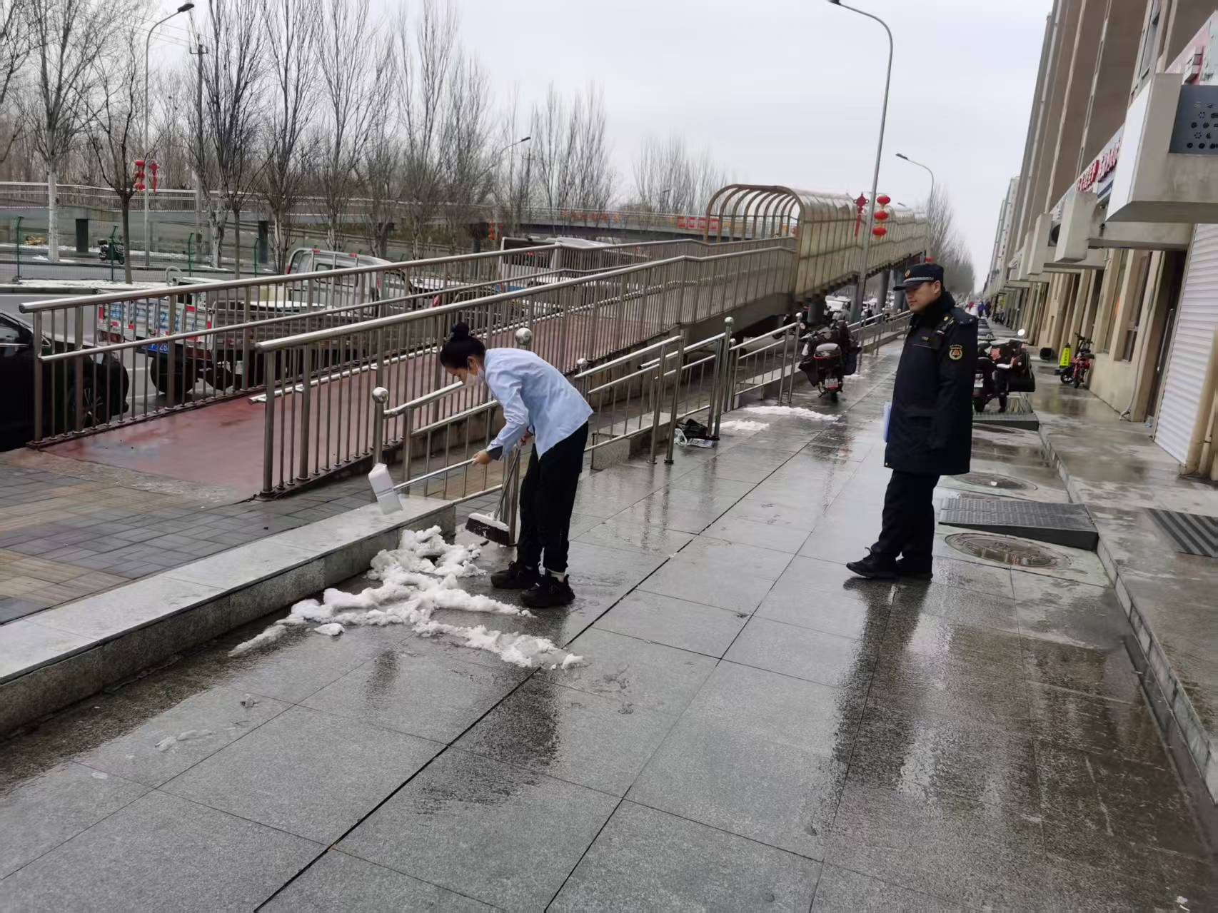2月27日,金盏执法队督促商户打扫门前雪,落实好门前三包责任(通讯员 金盏 吴柯)
