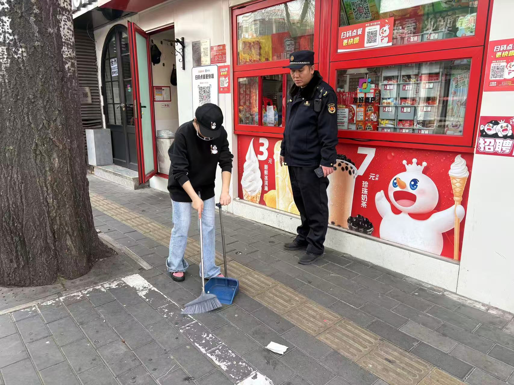 3月12日,奥林匹克中心区执法队督促园区商户落实“门前三包”责任。(通讯员 奥林匹克中心区 沈庆锋)
