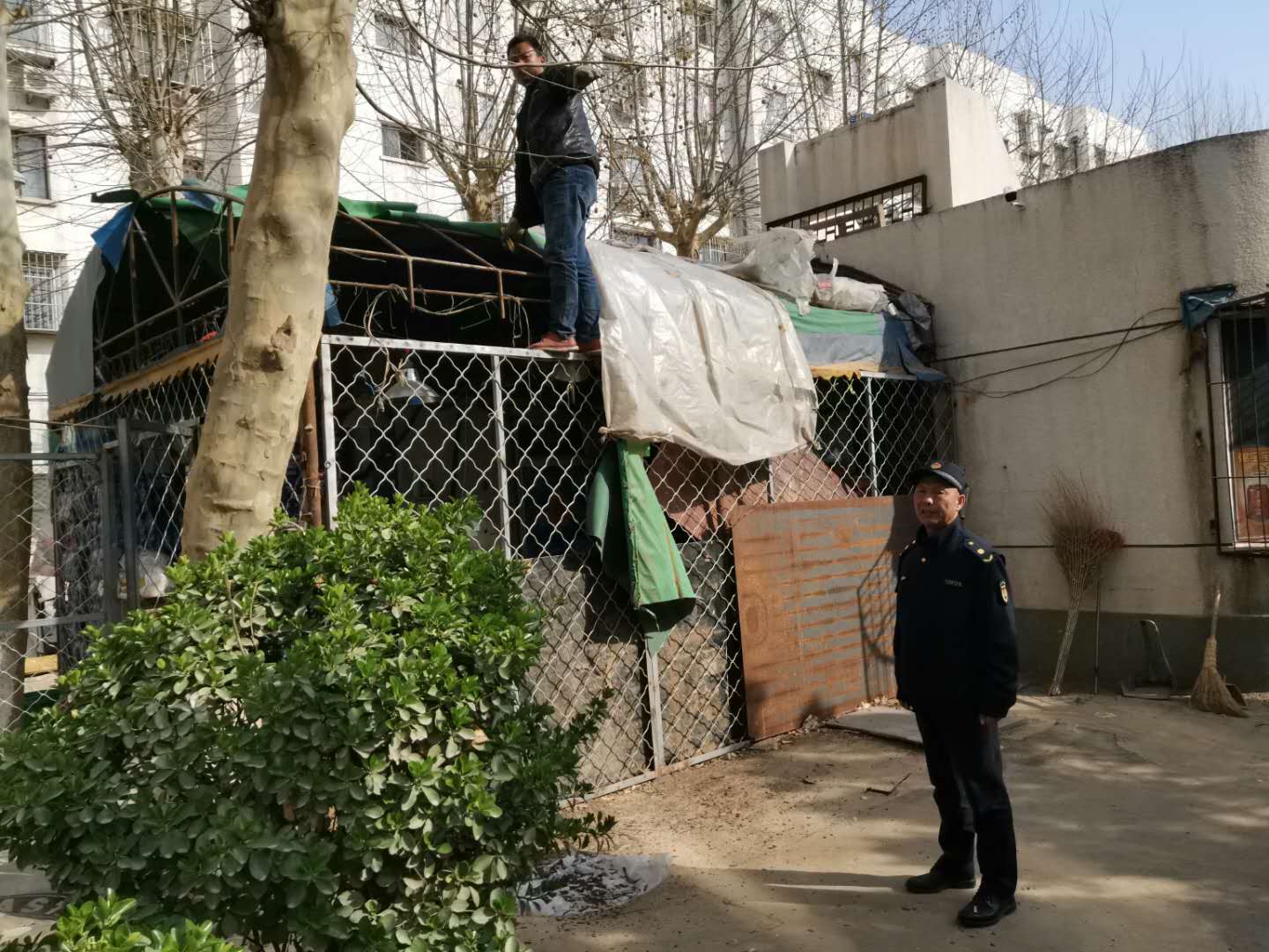 三间房执法队在定福庄北里1号院17号楼清理违规私搭乱建棚子