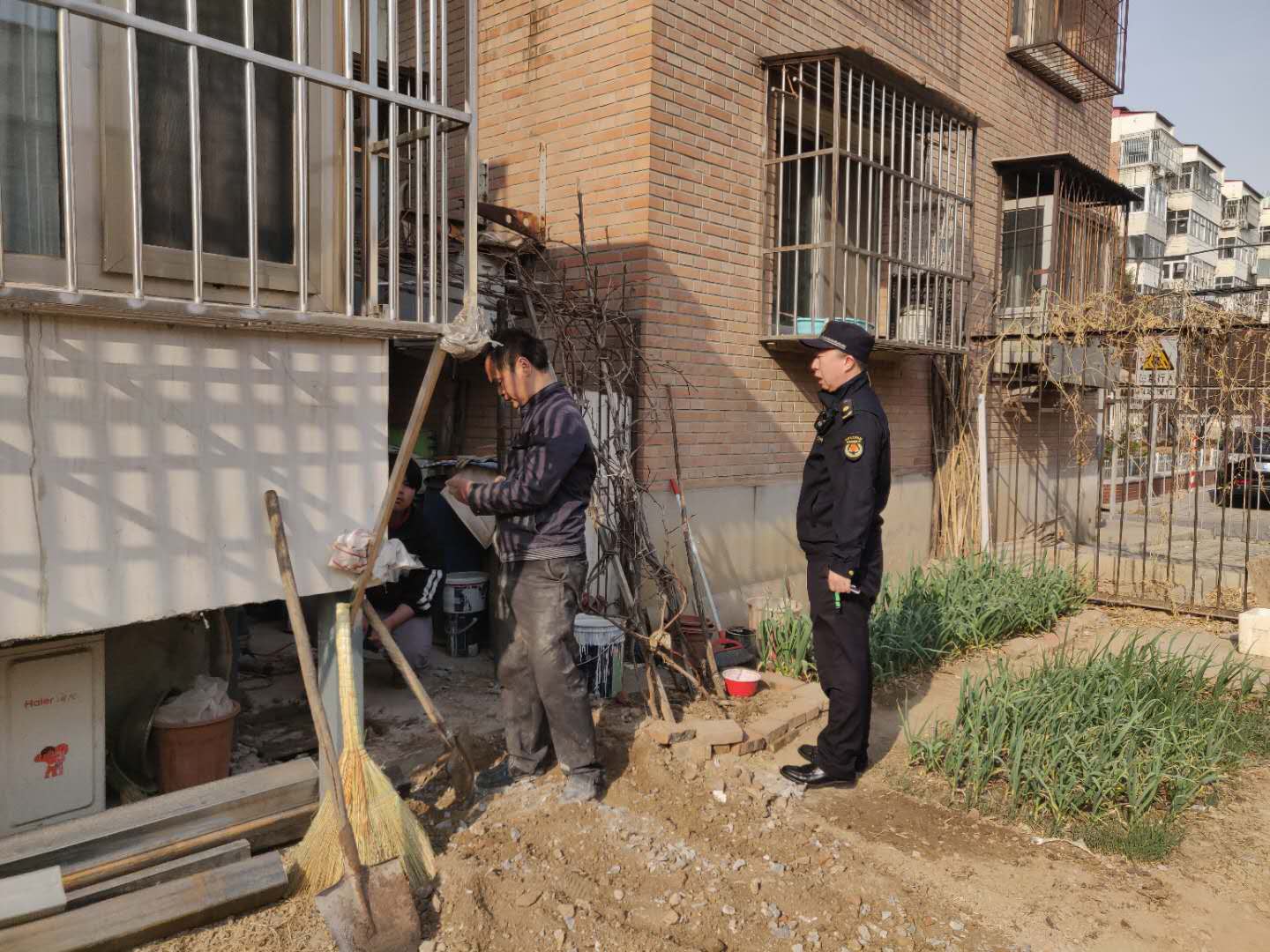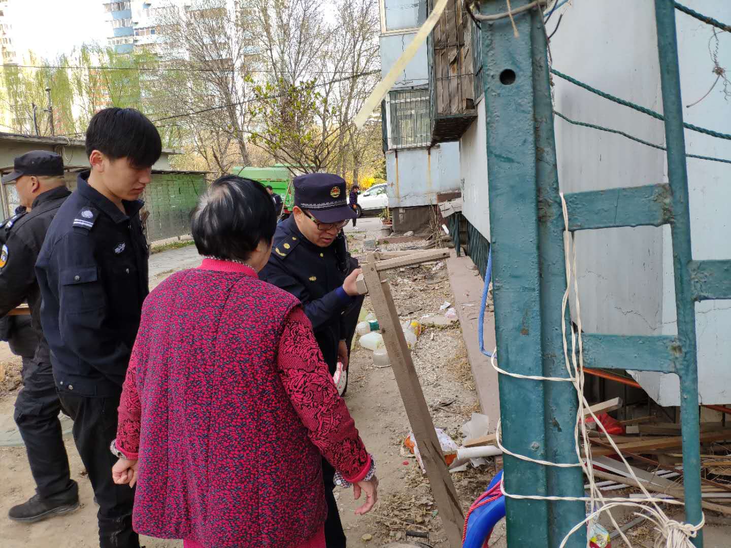 潘家园执法队联合辖区综治、城建、交通部门及街道派出所开展执法行动,对松榆东里小区内圈占绿地、私装地锁、私搭乱建行为进行整治