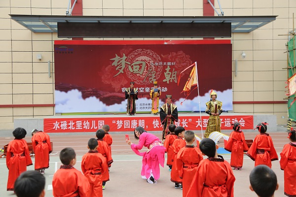历史是文化的积累和传承,也是人类文明的轨迹。为了增强幼儿对中华几千年文化的了解,对传统礼仪的认识,增强民族自尊心和自信心,萌发幼儿热爱祖国的情感。4月19日,水碓北里幼儿园携手北京天骄快乐家族围绕复兴强国的重要思想,联合举办“梦回唐朝”大型历史教育亲子运动会。