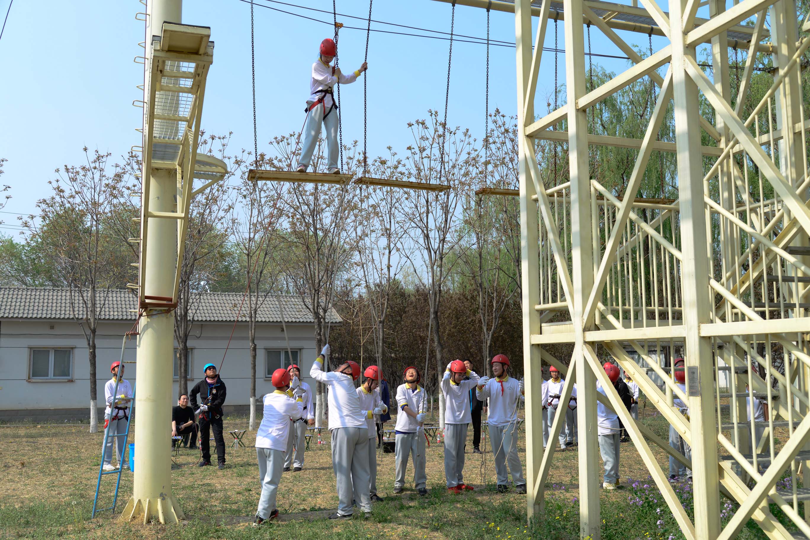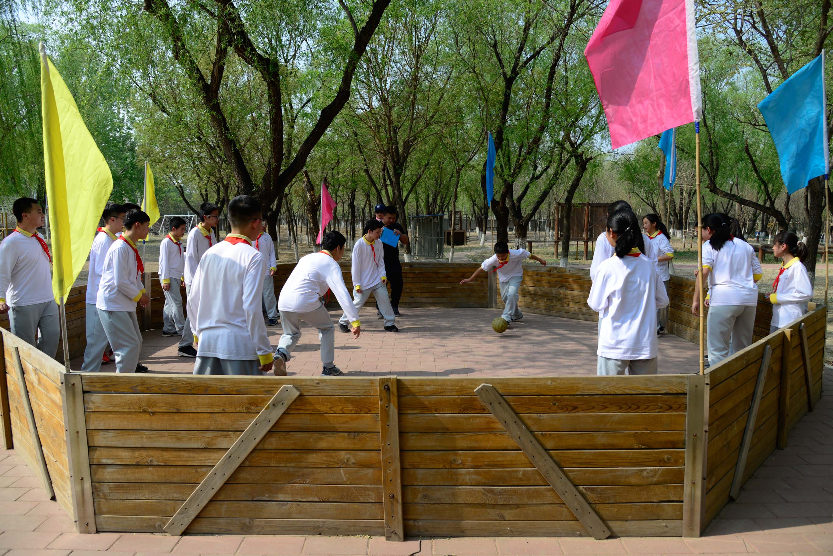 到达营地之后,营地总导师讲明注意事项后,各班由主领导师带到各自班级的活动场地,开展素拓活动。初一1班和2班进行“嘎嘎球”和“冒险家”的游戏。初一3班和4班进行“鼓动人心”和“齐心协力”的游戏。
