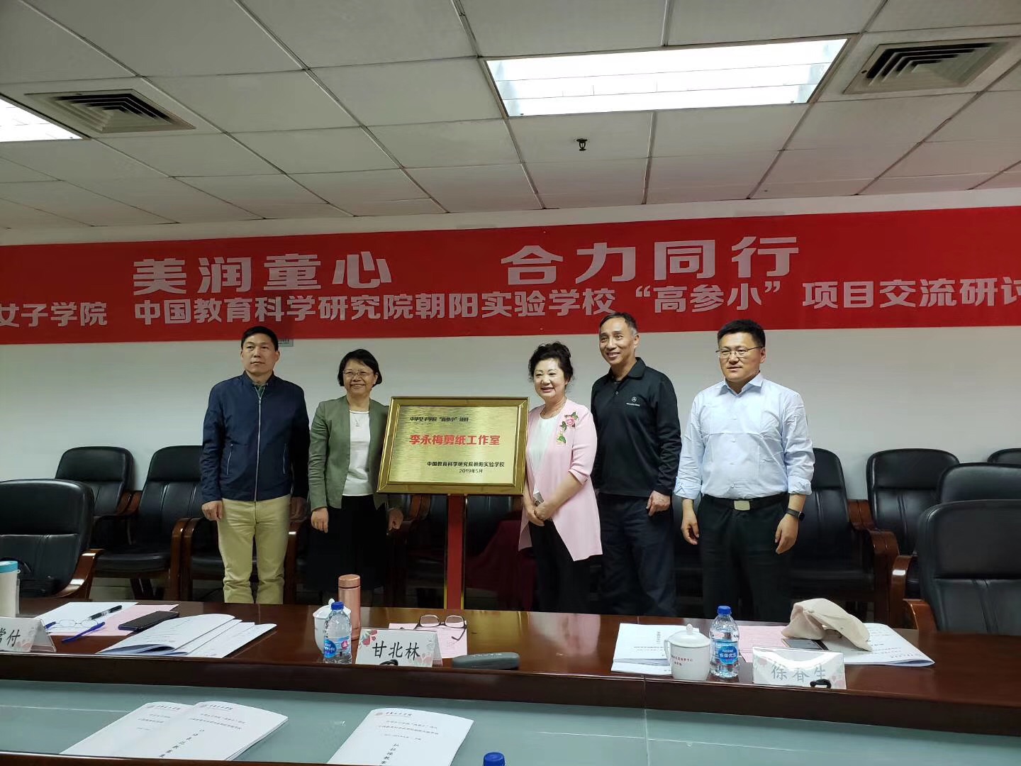 北京市教委“高参小”领导小组办公室主任甘北林、北京市教委体卫艺处艺术专干徐春生、中华女子学院副院长王练、朝阳区教委体美科科长赵常付、中国教育科学研究院朝阳实验学校校长刘明成,同时还有北京市教委“高参小”项目办公室、朝阳区教委、中国教科院、中华女子学院相关人员参加了揭牌仪式。甘北林、王练、赵常付、刘明成一起为工作室揭牌。