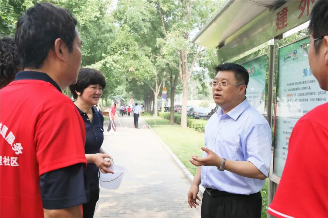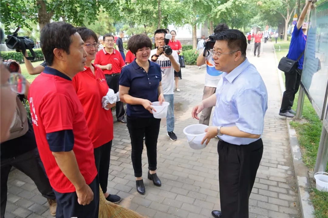 7月27日早上,朝阳区委书记王灏来到建外街道建国里社区参加“全民创卫一起来爱国卫生大扫除”创卫活动,区政协副主席、区总工会主席、区创卫办执行主任张永新一同参加。