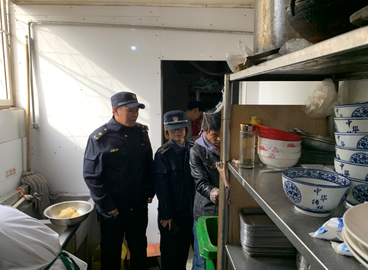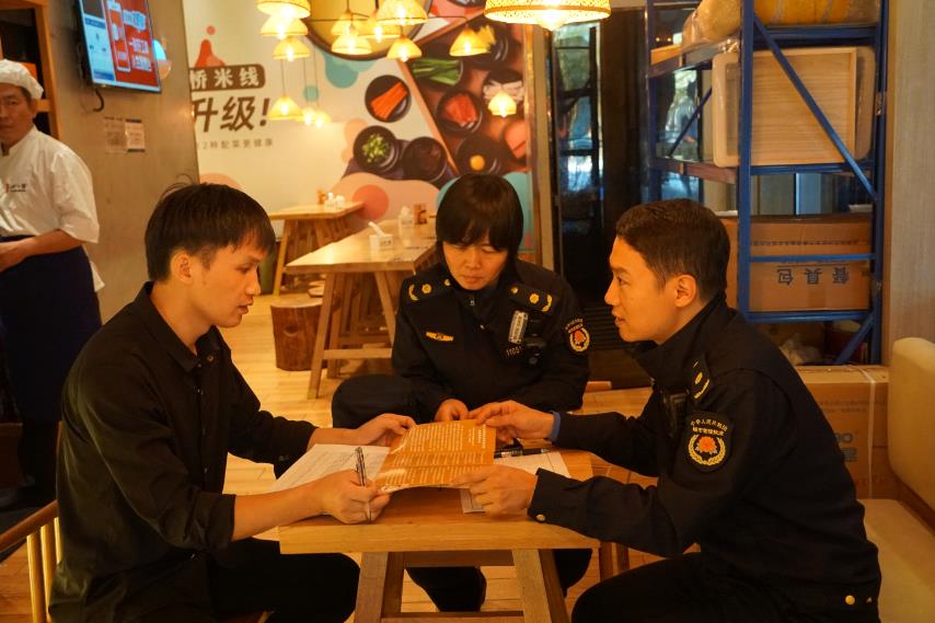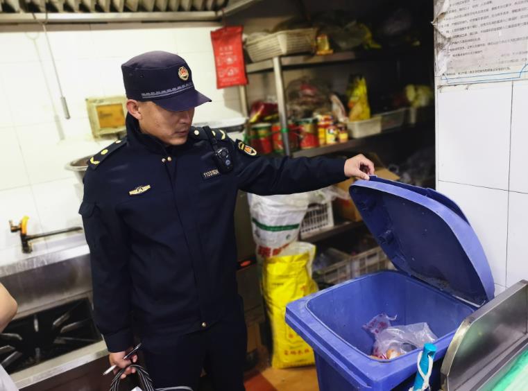 奥园大队四执法队检查园区餐饮单位餐厨垃圾分类收集及相关台账登记情况