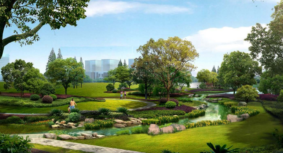 郭家场南侧绿地景观建设以“凤鸣朝阳、舞动山水”为主题,以传统自然风景作为基调,运用象征凤凰飞舞姿态的曲线与中国传统园林景观的融合,为现代空间注入凝练唯美的中国古典山水情韵,截至目前,已完成平整场地5万多平方米,绿化18万平方米。