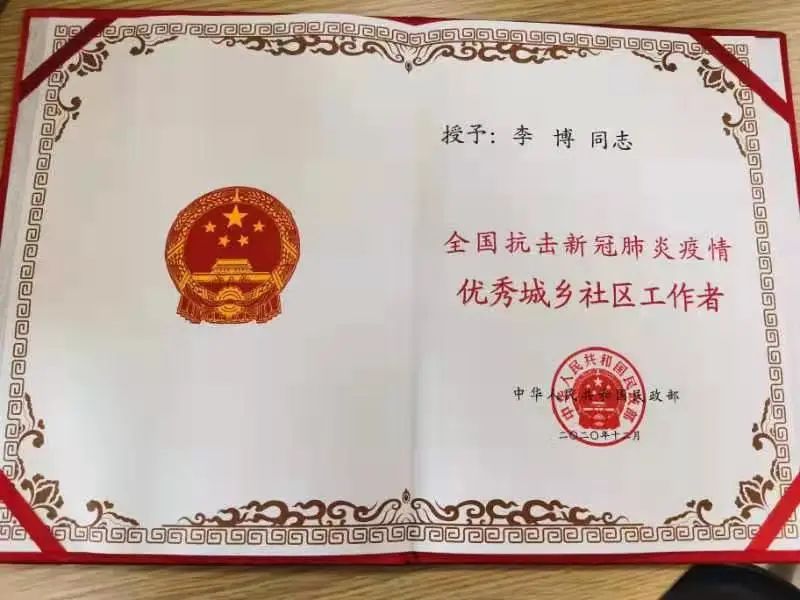 热烈祝贺李博同志荣获“全国抗击新冠肺炎疫情优秀城乡社区工作者”称号