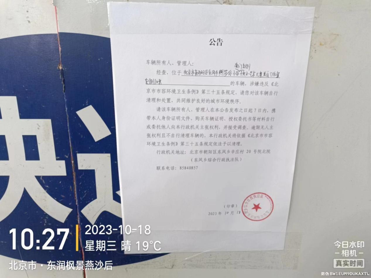 请该车辆所有人、管理人在本公告发布之日起7日内,携带本人身份证明文件、购买车辆证明、授权委托书等材料自行或委托他人向本行政机关主张权利,并接受调查。逾期无人主张权利且不自行清理车辆的,本行政机关将依据《北京市市容环境卫生条例》第三十五条规定依法予以清理。