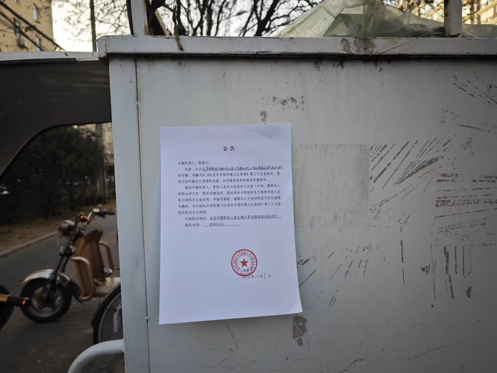六里屯街道关于清理整治废弃电动三四轮车的公告(甜水园北里13号楼北侧20米处便道)-01