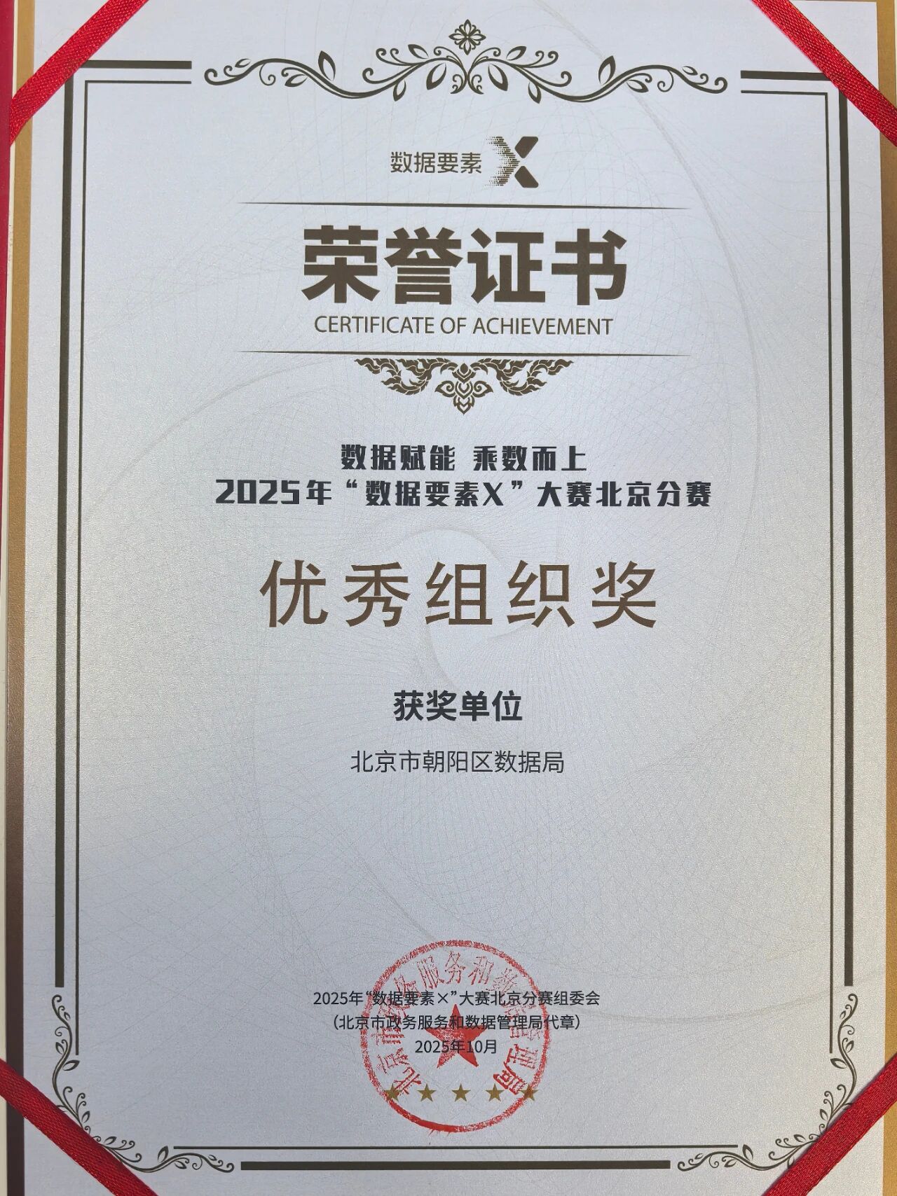 10月17日,在由国家数据局和北京市人民政府指导、北京市政务服务和数据管理局等30余个部门联合举办的2025年“数据要素×”大赛北京分赛颁奖仪式上,区数据局作为北京分赛承办单位,荣获优秀组织奖奖项。