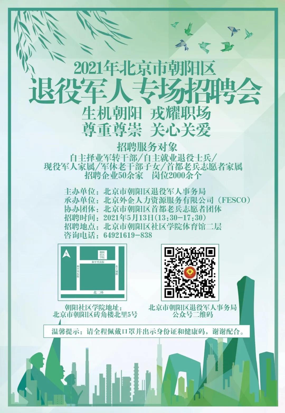 为推进退役军人就业工作,由朝阳区退役军人事务局主办,北京外企人力资源服务有限公司(FESCO)承办的2021年北京市朝阳区退役军人就业专场招聘会将在朝阳区社区学院举行,招聘会服务对象主要涵盖辖区内自主择业军转干部、自主就业退役士兵、现役军人家属、军休老干部子女、首都老兵志愿者家属,提供涉及医疗、互联网、培训、行政、技术、财务、管理、物流、市场营销、物业等多领域共计2000多个就业岗位。欢迎您参加,祝您成功!
