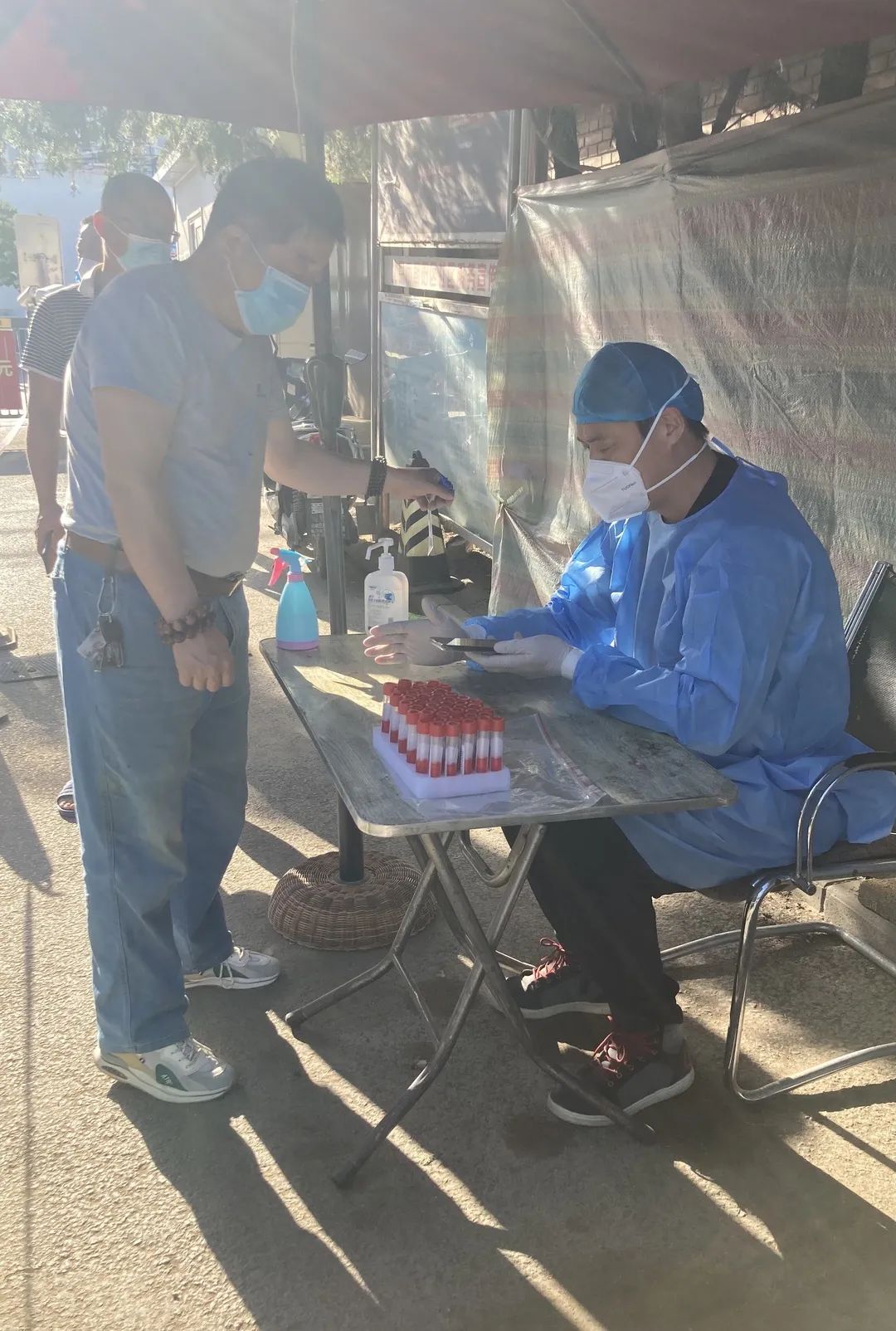 杜洋 ,党员、交易中心干部:连日来,气温持续攀升,室外温度高达36摄氏度,但抗击疫情义不容辞,我深知支援没有假期周末,不管降温降雨,还是高温酷暑,依旧坚守在自己的阵地,默默为广大社区居民进行核酸信息登记,协助医务人员完成核酸检测工作。出发时,我就立下了“疫情当下,攻克乃还”的誓言,如今,我用辛勤和汗水,为当地居民身体健康和生命安全筑牢了抗击疫情的坚固防线,用实际行动描绘了烈日之下的那一抹“蓝色清凉”。闻令而动,集结出征,这就是“政务人”的责任、使命和担当所在。愿我们守望相助,共克时艰。