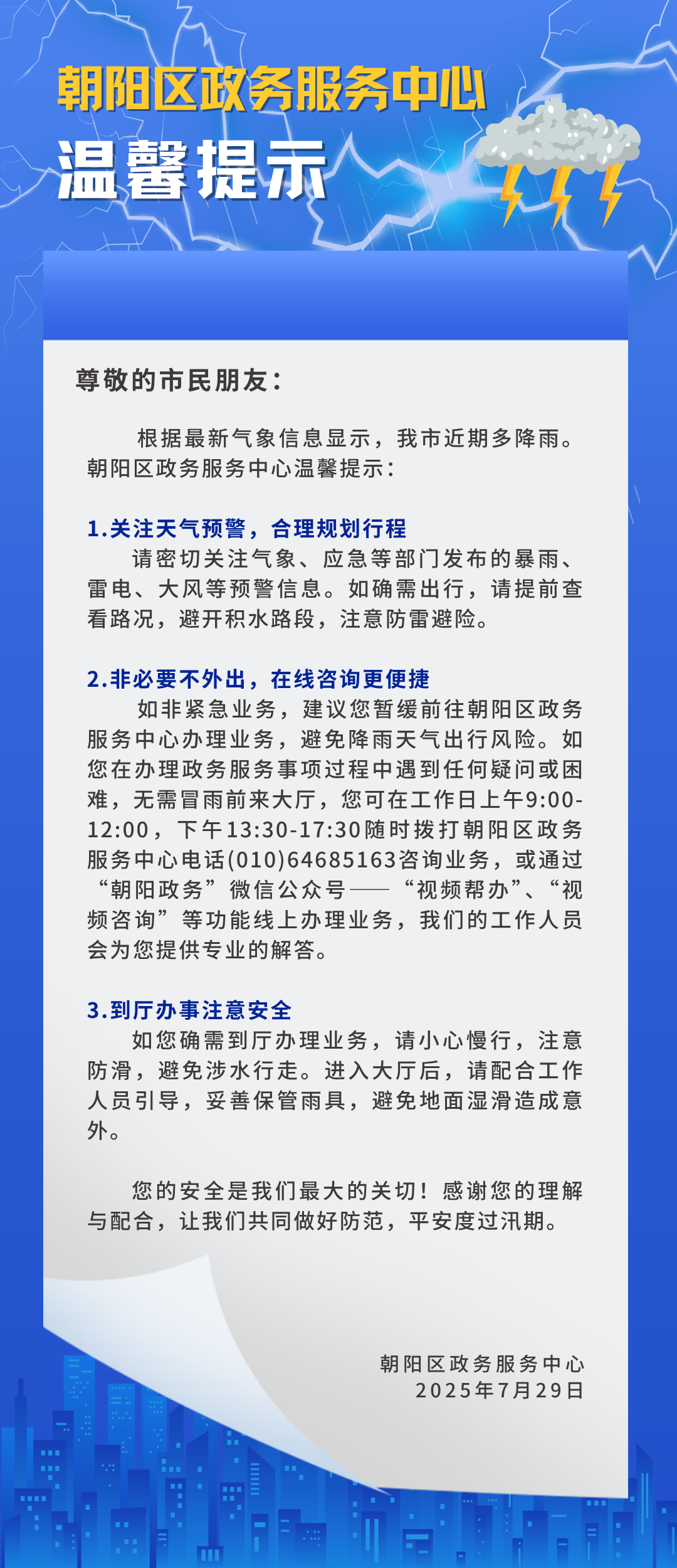 @朝阳市民 近期多降雨,朝阳区政务服务中心温馨提示请查收