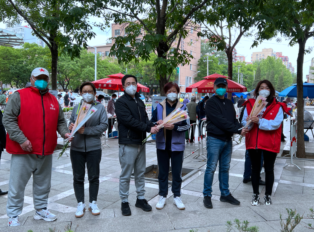 在母亲节这个特殊的节日,街道处级领导代表街道工委、办事处慰问在岗母亲,为一直坚守在疫情防控点位上的母亲们送上了由和平街街道商会热情赞助的鲜花。在政务中心和和平家园采集点,街道工委书记秦涛、办事处主任关进国与和平街街道商会秘书长张晓茜共同将鲜花送到了在场的母亲们手中,鲜花寄托着街道和社会组织对一线工作人员与志愿者母亲们的感谢和祝福,祝她们母亲节快乐。