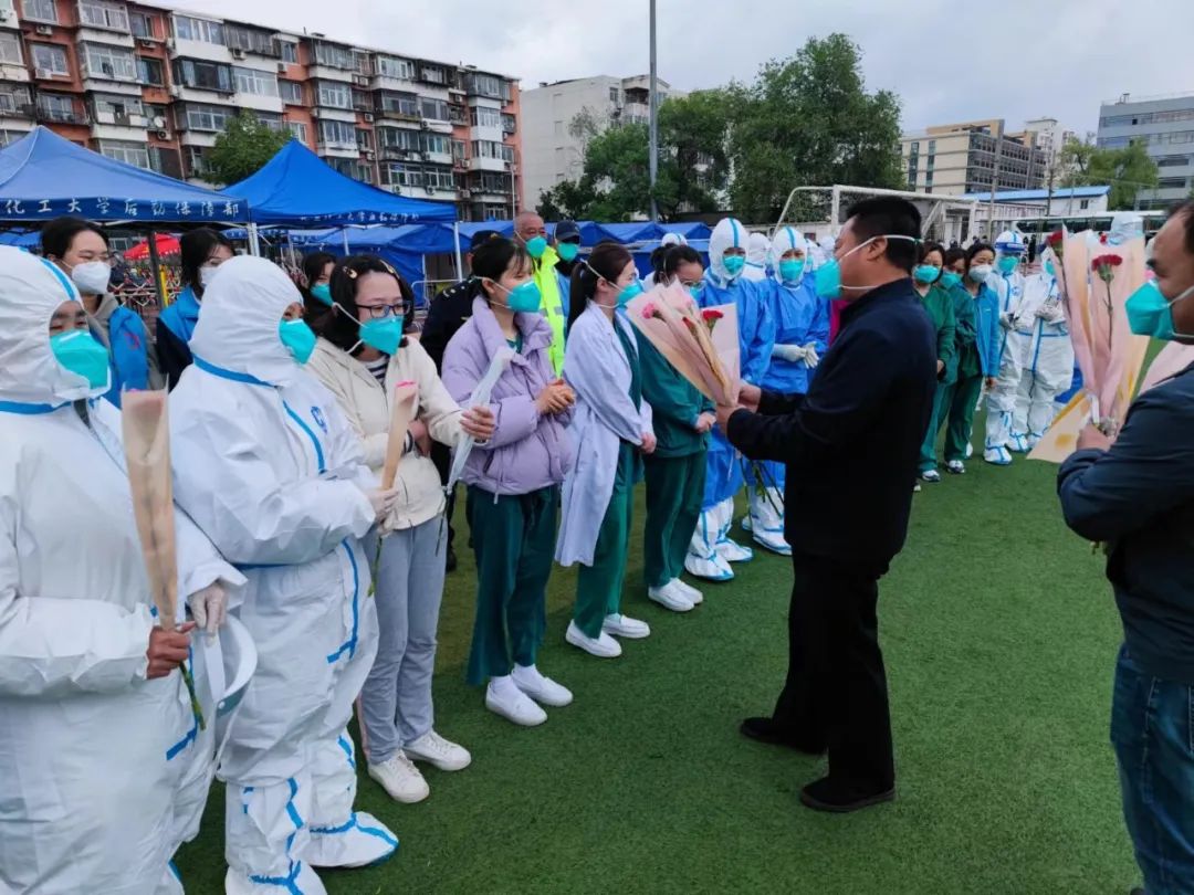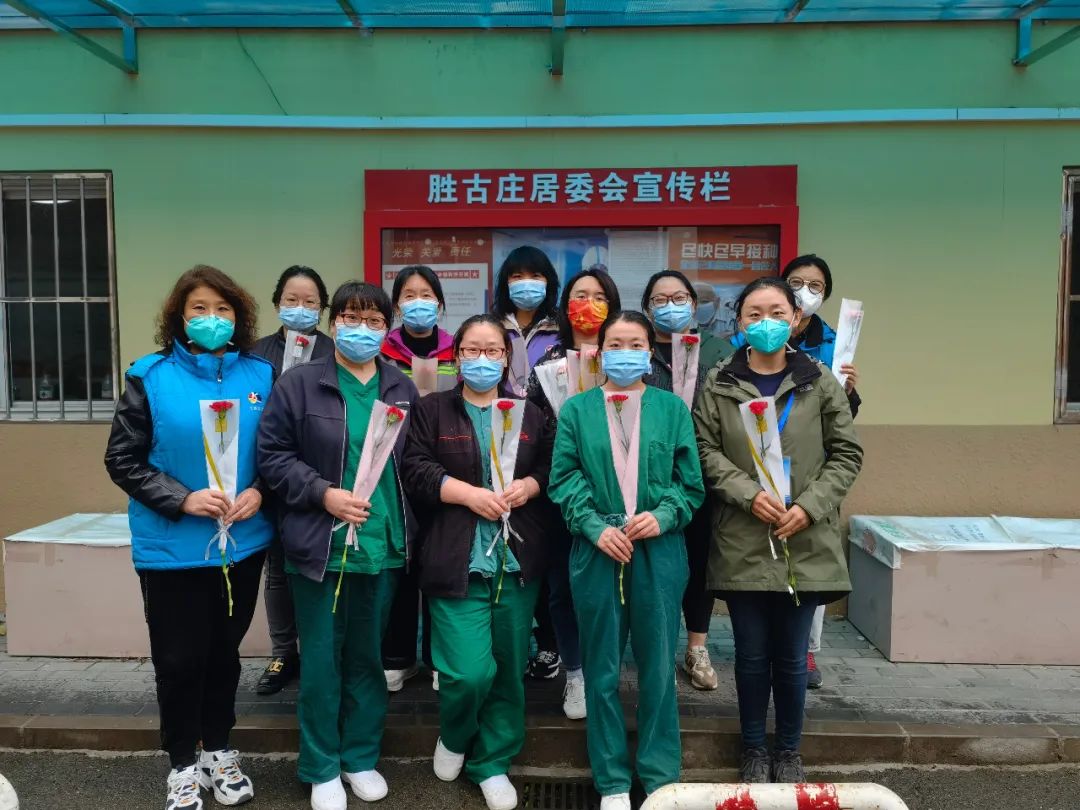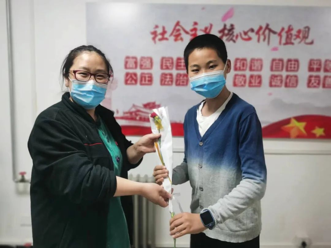 胜古庄社区工作者刘敬沙的儿子,为医务工作者献花,表达对奋战抗“疫”一线医务工作者的敬佩之情。
