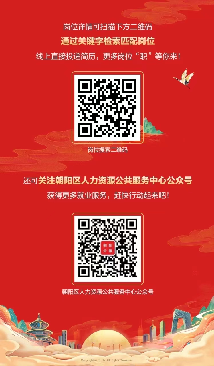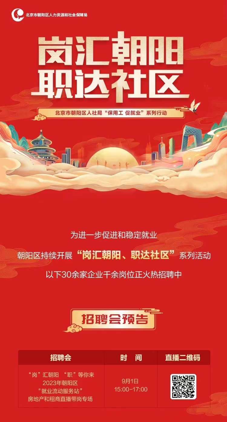 “岗汇朝阳 职达社区”是朝阳区人力资源和社会保障局为保用工、促就业开展的系列活动。 本期招聘大厅精心挑选了6000余个位于朝阳区的岗位,部分岗位详情可在长图中查看。 此外,9月1日下午15:00-17:00将在线上开展“岗”汇朝阳 “职”等你来-房地产和租商直播带岗专场,届时识别图中的直播二维码即可进入直播间。 更多岗位、招聘会预告,可识别图片下方“岗位搜索二维码”直接获取,线上一键投递简历,更多机会“职”等你来!