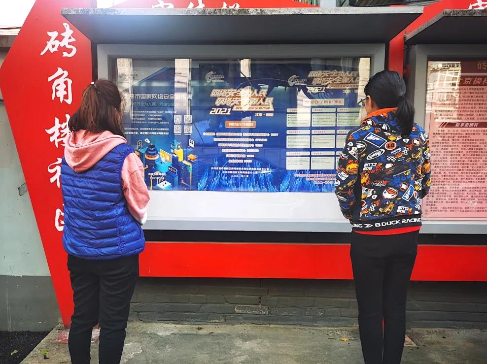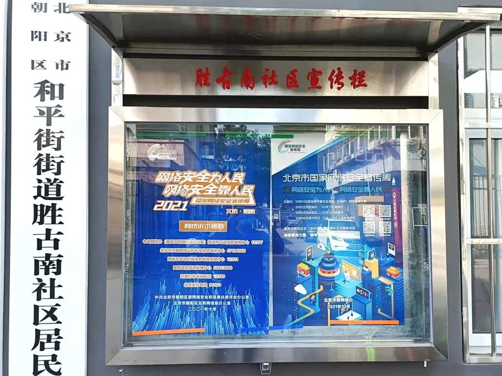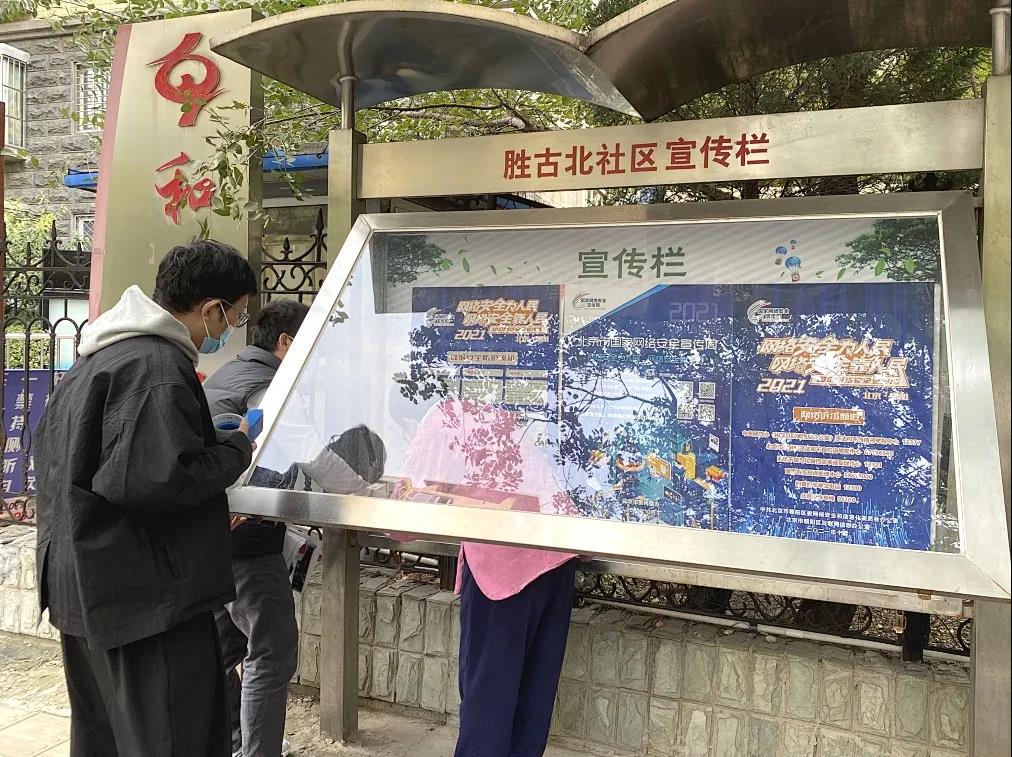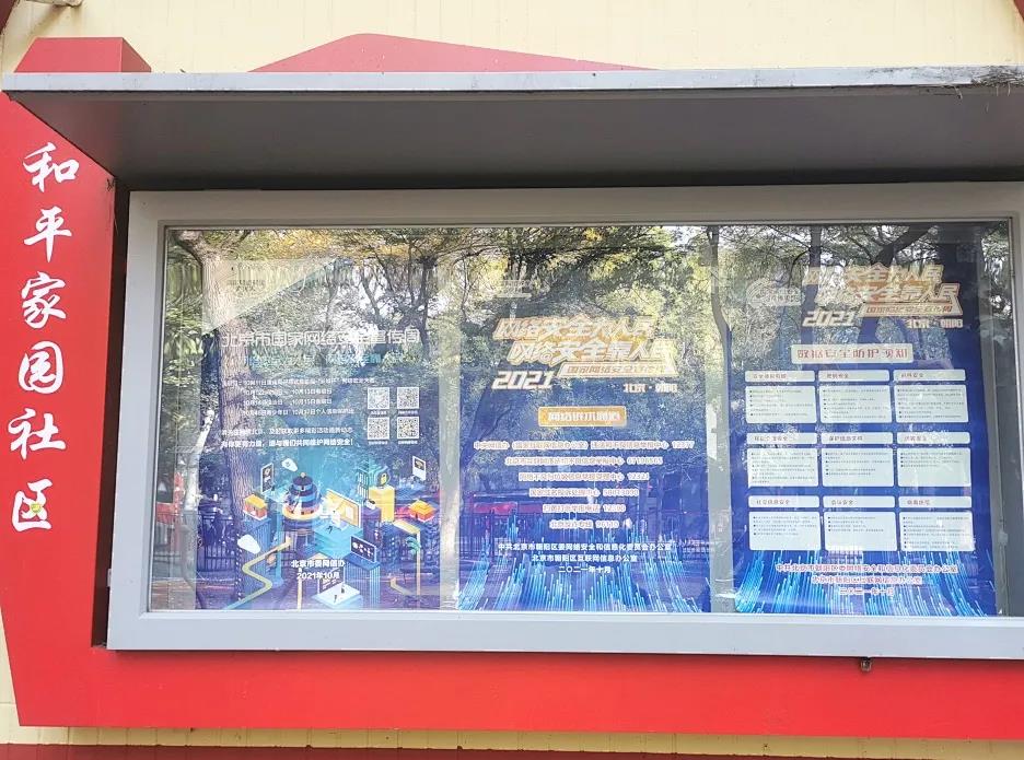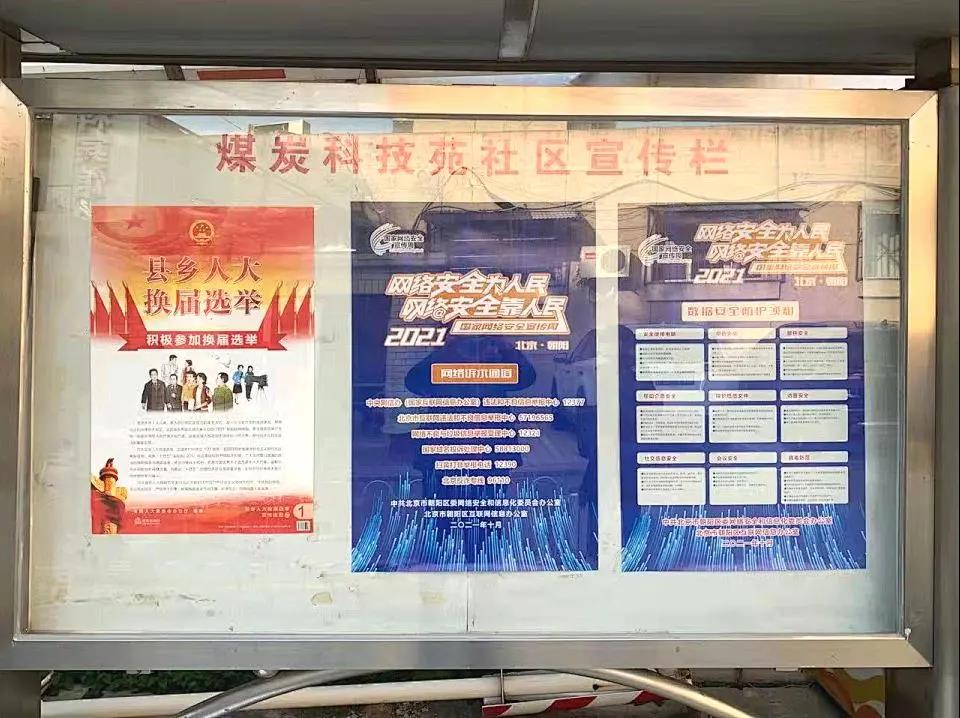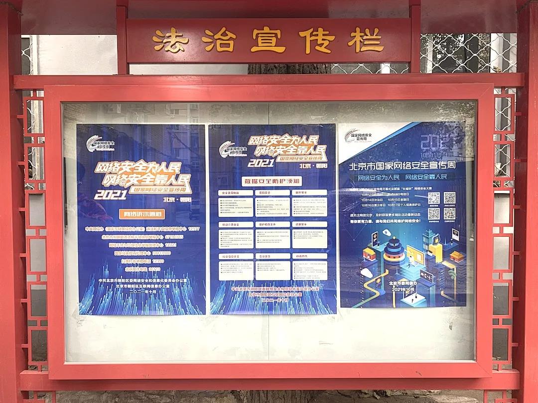 自10月11日起,街道各社区陆续组织社区志愿者,在社区宣传栏内张贴“北京市2021年国家网络安全宣传周”主题宣传海报,重点对宣传周主题日活动、网络诉求通道、数据安全防护等内容进行宣传,切实提升辖区居民的网络安全防护技能。