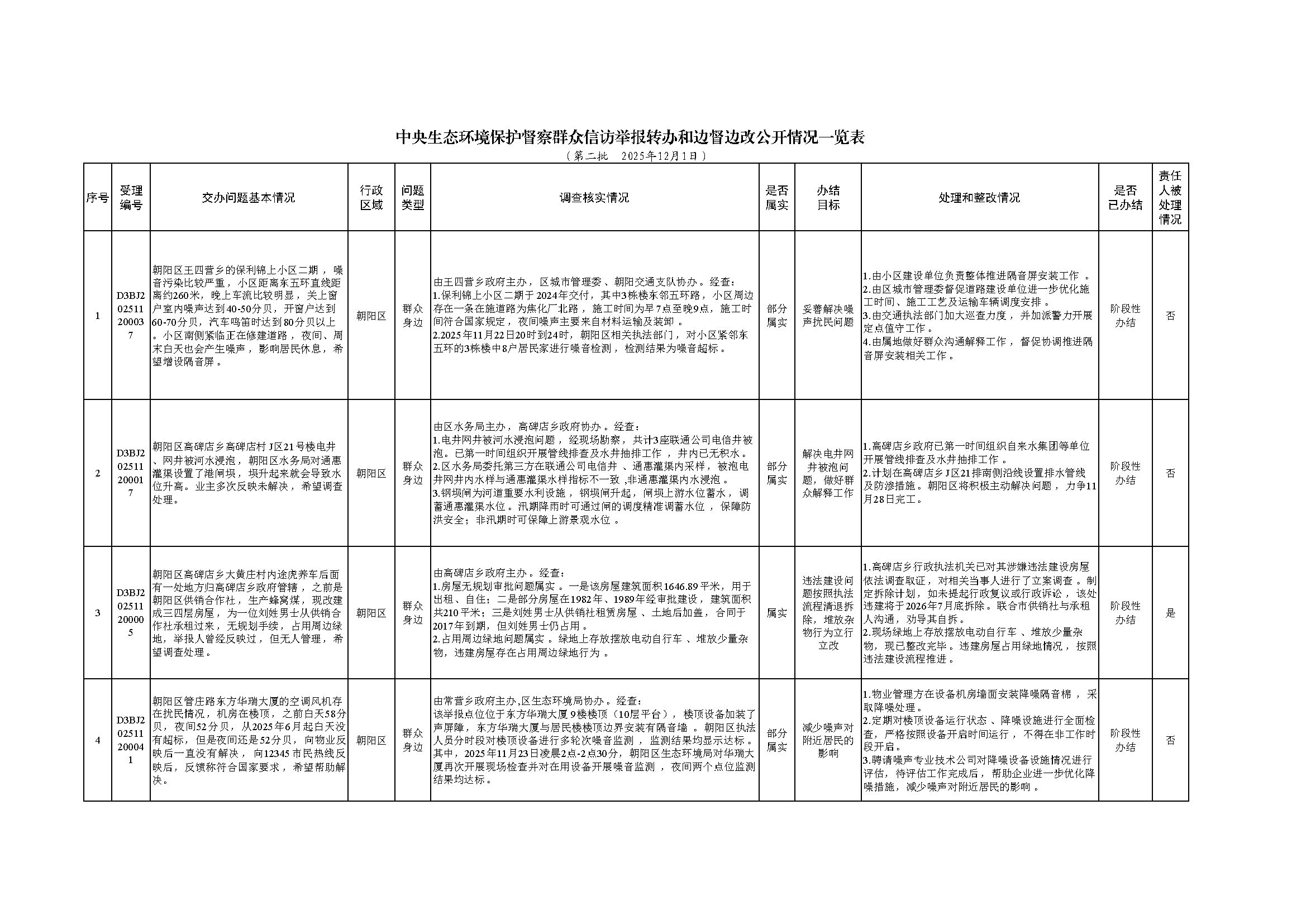 2025年11月21日,中央第一生态环境保护督察组向北京市交办第二批群众信访举报件33件(其中1件依据有关规定不予公开),涉及朝阳区4件。现按要求向社会公开本区该批次《中央生态环境保护督察群众信访举报转办和边督边改公开情况一览表》(见下表)。