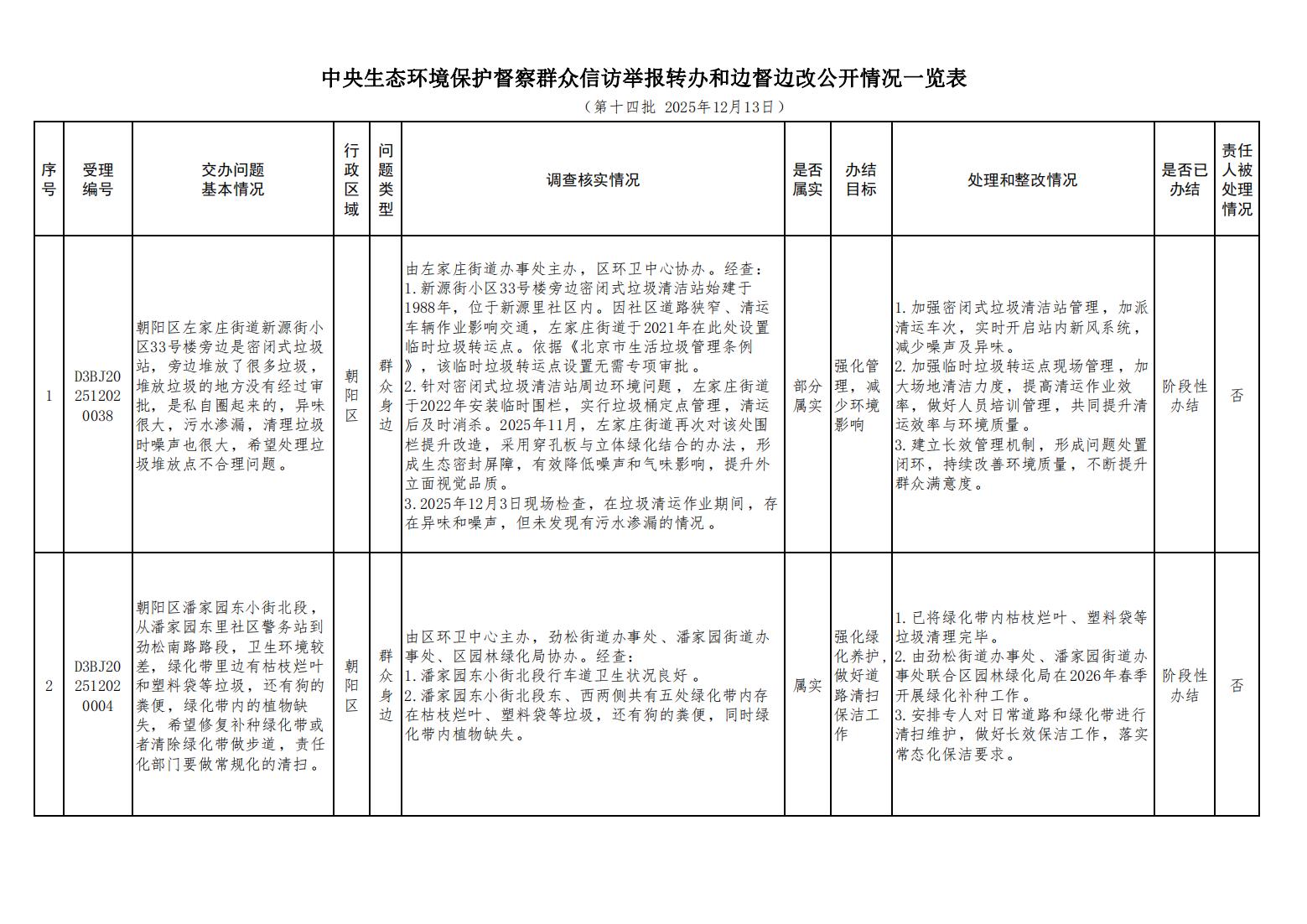 2025年12月3日,中央第一生态环境保护督察组向北京市交办第十四批群众信访举报件34件,涉及朝阳区2件。现按要求向社会公开本区该批次《中央生态环境保护督察群众信访举报转办和边督边改公开情况一览表》(见下表)。
