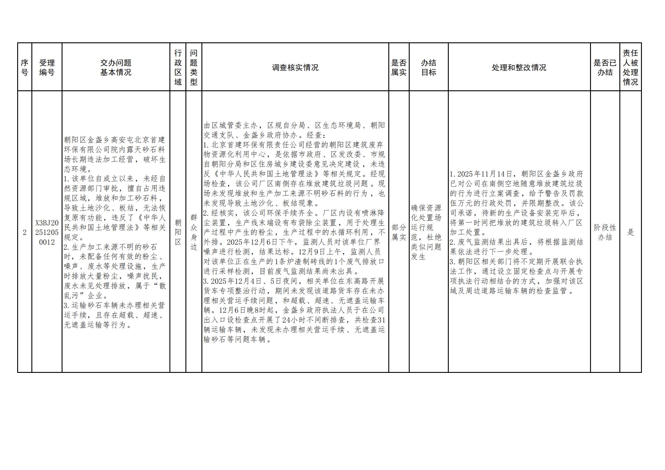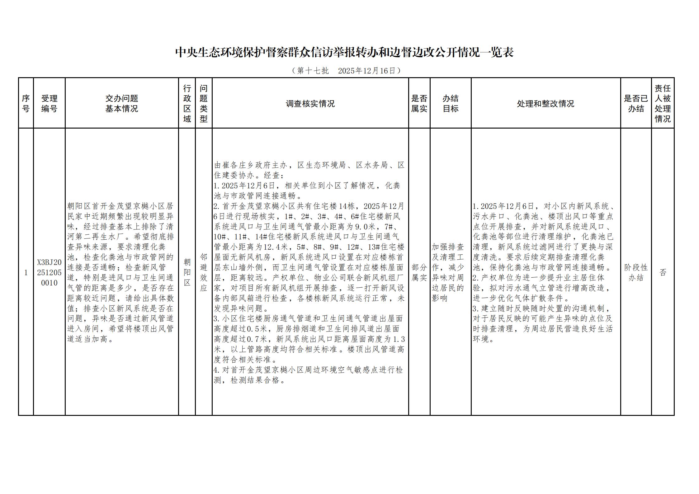 2025年12月6日,中央第一生态环境保护督察组向北京市交办第十七批群众信访举报件32件,涉及朝阳区2件。现按要求向社会公开本区该批次《中央生态环境保护督察群众信访举报转办和边督边改公开情况一览表》(见下表)。