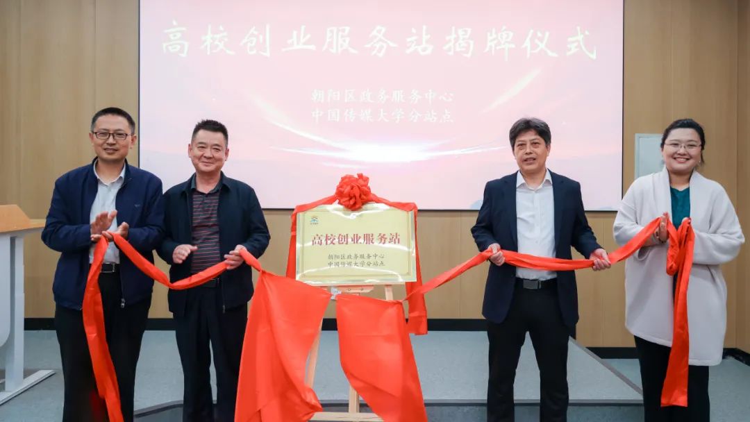 会上,朝阳区政务服务管理局局长王冬岩同志、朝阳区政务服务管理局党组书记杨汉安同志、中国传媒大学党委副书记张绍华同志、中国传媒大学学生工作部部长郭婧娜同志携手完成高校创业服务站——中国传媒大学分站点揭牌仪式。